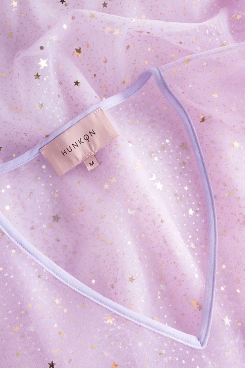 Wauw den smukkeste kjole er landet fra HUNKØN. En smuk lilla sag i transparent materiale med glitrende guld stjerner. Kjolen er i tyl kvalitet og designet med flæsedetalje i taljen og løse ærmer med knappelukning i bunden. Styl kjolen med en basiskjole under eller over et basis outift.