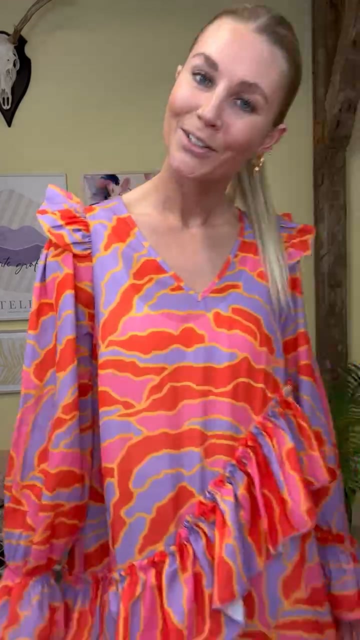 Iiih, se lige den populære "Ruffle Dress" fra HUNKØN. Nu er den landet i den smukkeste farvesammensæting som jo stråler af forår. Kjolen er løs i modellen med et v-udskæring ved halsen. Den har de fineste flæsedetaljer ved skulderen, midt på maven og som en peplum effekt i bunden. Denne kjole kan nemt styles op og ned alt efter hvilket anledning du skal til.