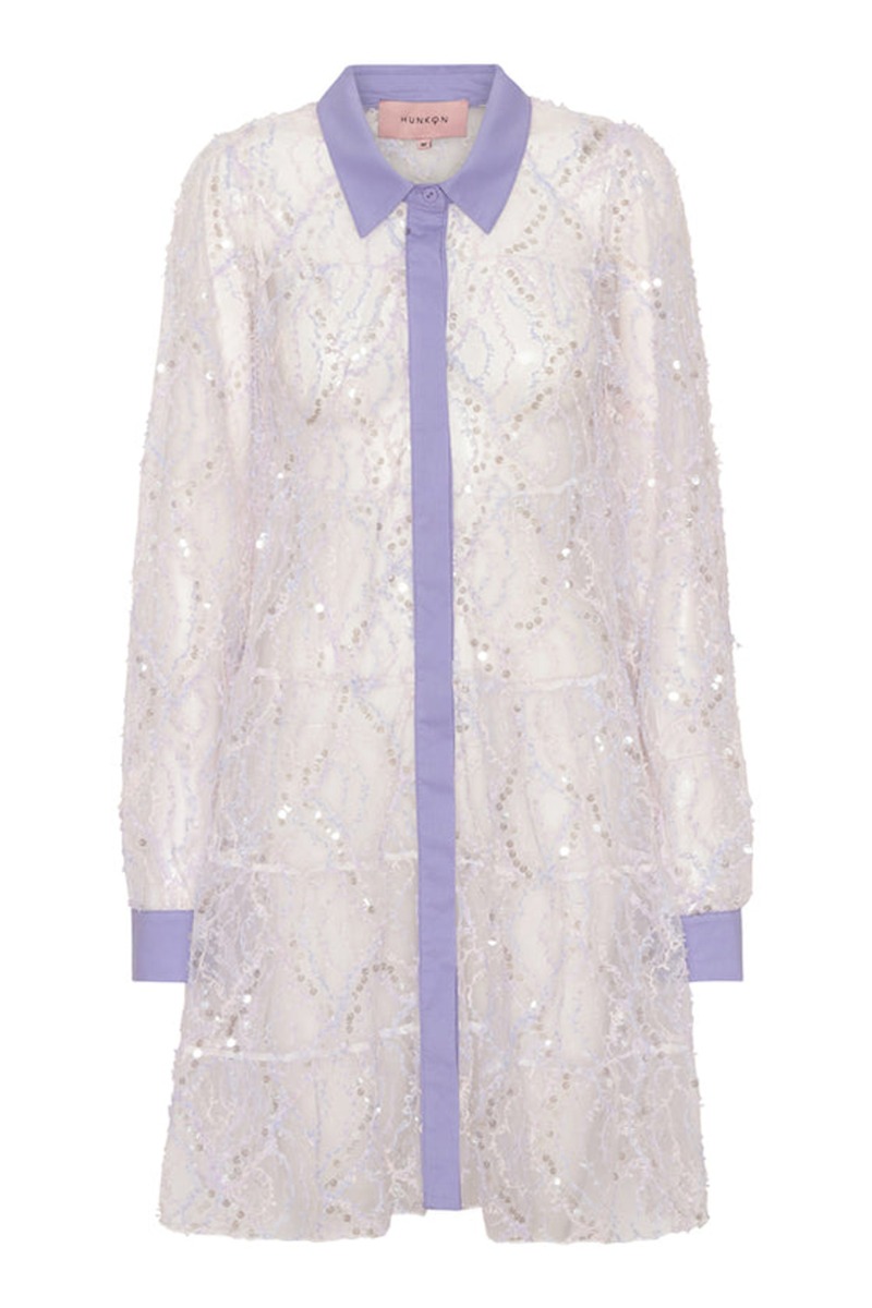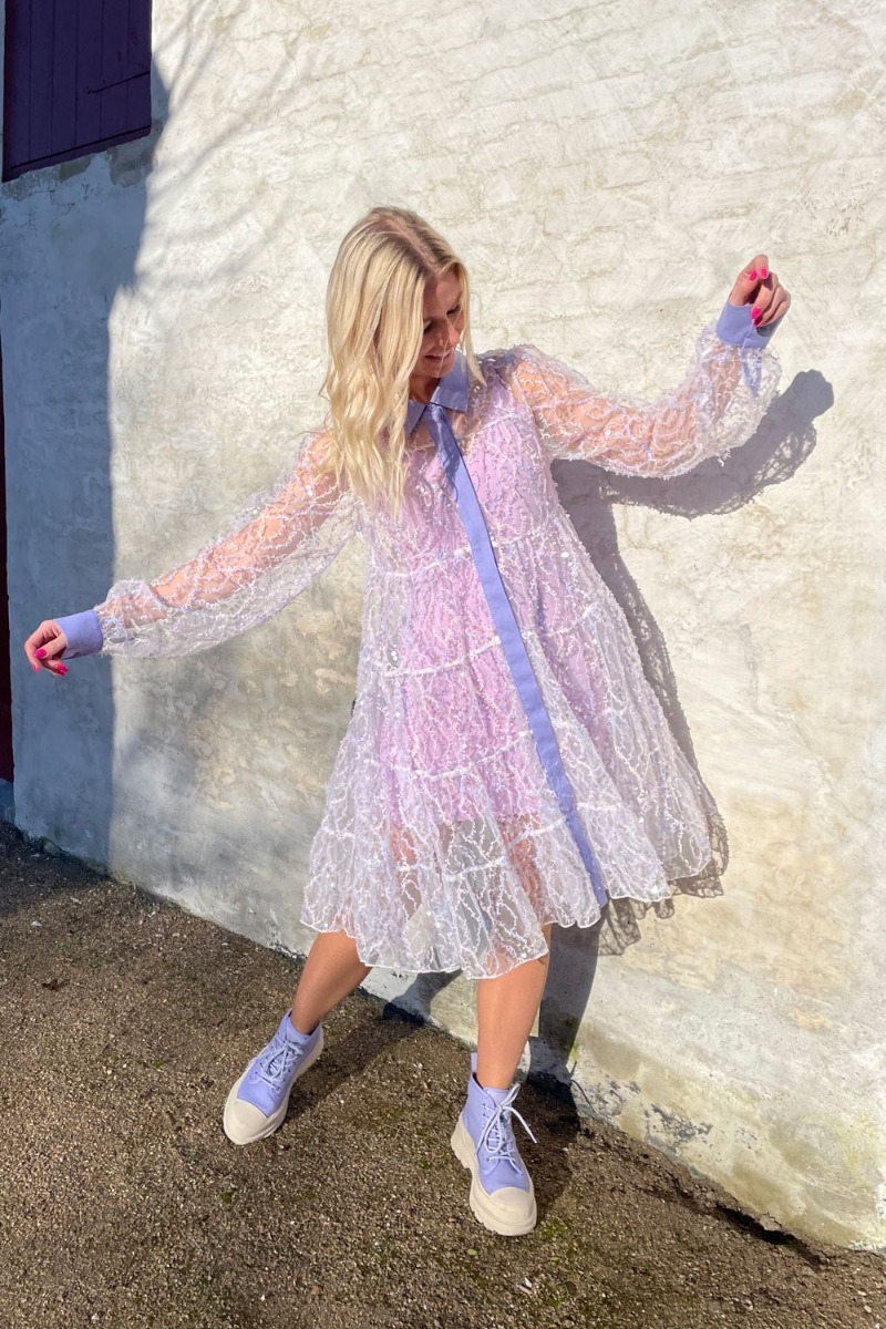 Hunkøn har virkelig bare styr på det med detaljer og det ses virkelig på denne fortryllende kjole! Kjolen har et taknemmeligt snit med peplum og er designet med de smukkeste små shiny pailetter og et grafisk mønster i lavendel nuancer. Kjolen er transparent, hvilket gør den super smuk med en lavendel underkjole under eller over et par bukser og en kort top for et mere cool look.