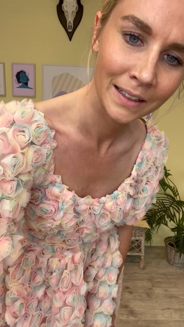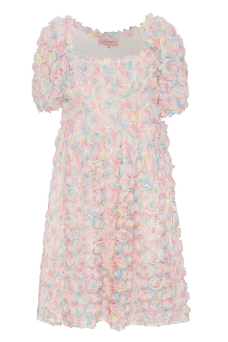 Ejj piger, her er den smukkeste kjole fra Hunkøn med smukke pastelfarvet 3D blomster på. Kjolen har den smukkeste pasform i et løst snit med masser af volume i skørtet. Den har korte t-shirt ærmer med balloneffekt og en smuk firkantet udskæring. Kjolen er oplagt at style til bryllup, barnedåb eller anden festlig anledning.
