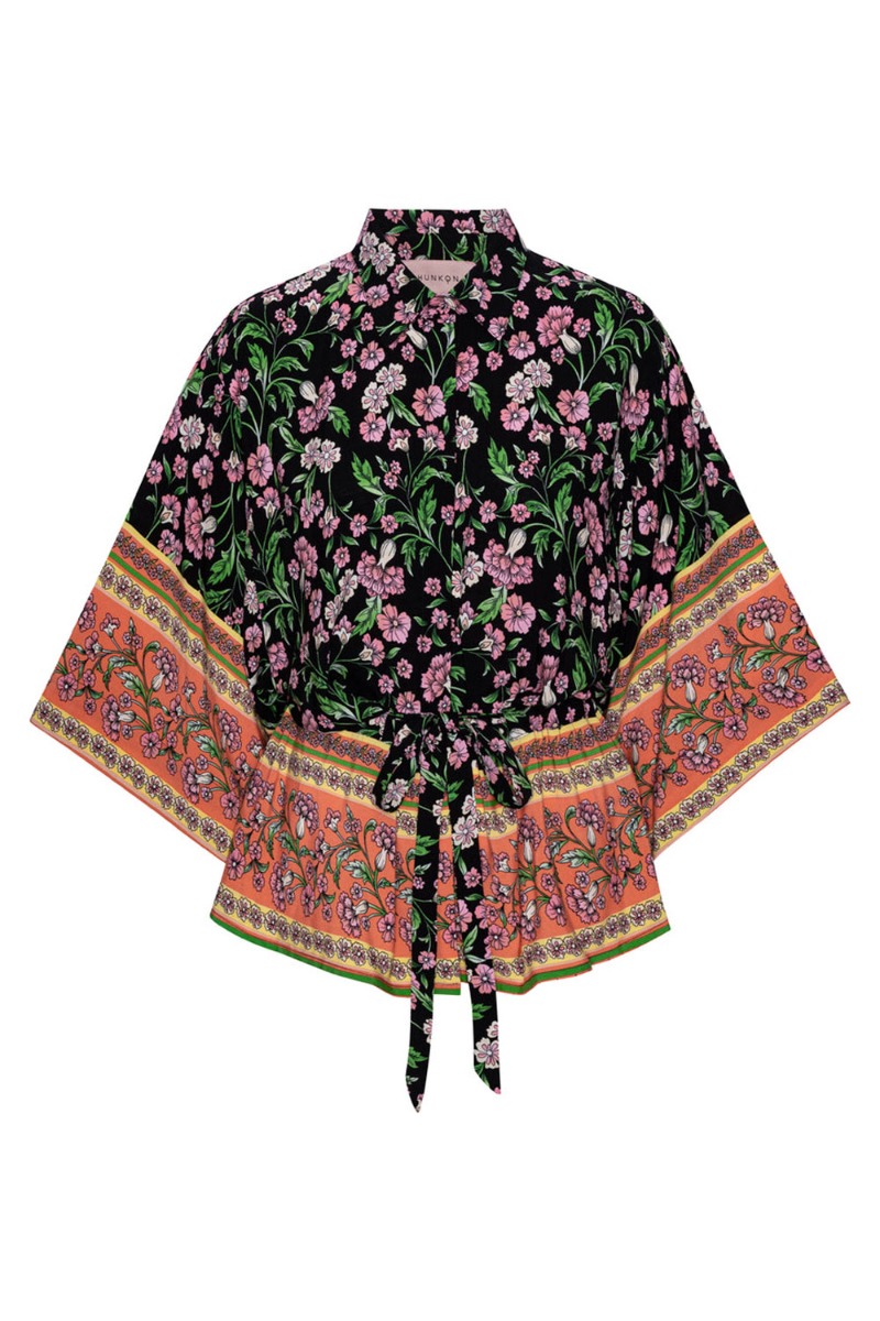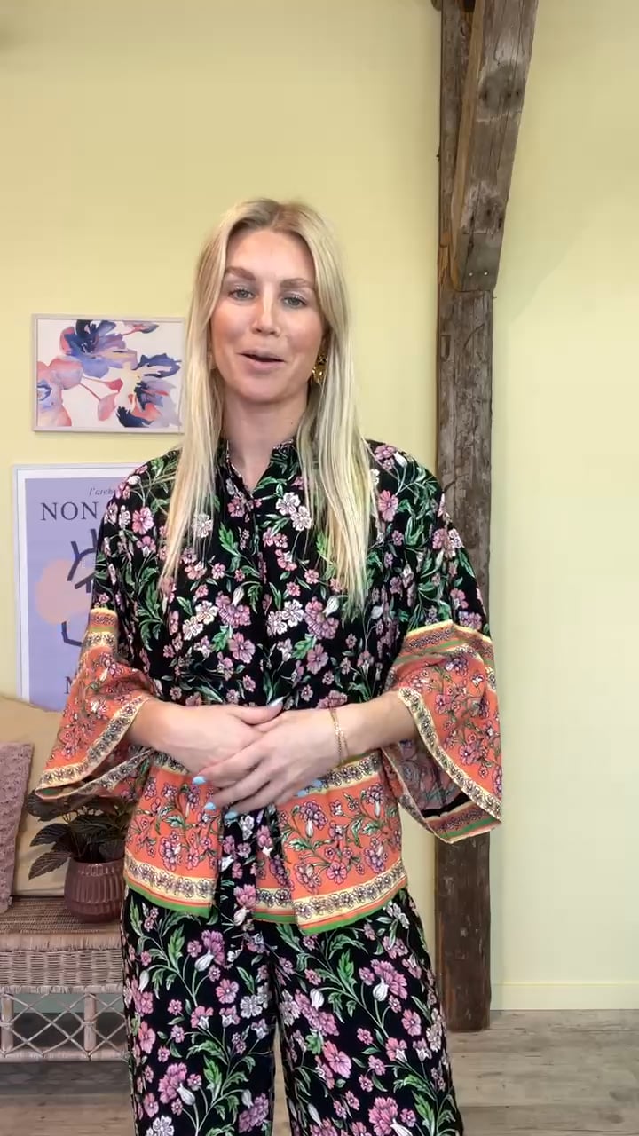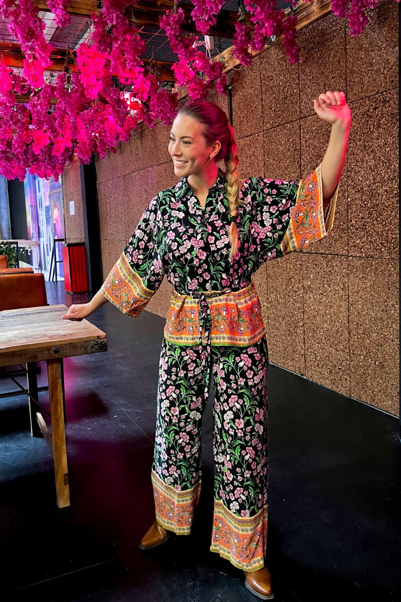 En smuk iøjenfaldende bluse med matchende bukser fra Hunkøn. Blusen er med sort baggrund og et rigtig sødt sommerprint med blomster der virkelig får en til at tænke på sommer og varme himmelstrøg. Den har knapper foran og bindebånd i taljen.