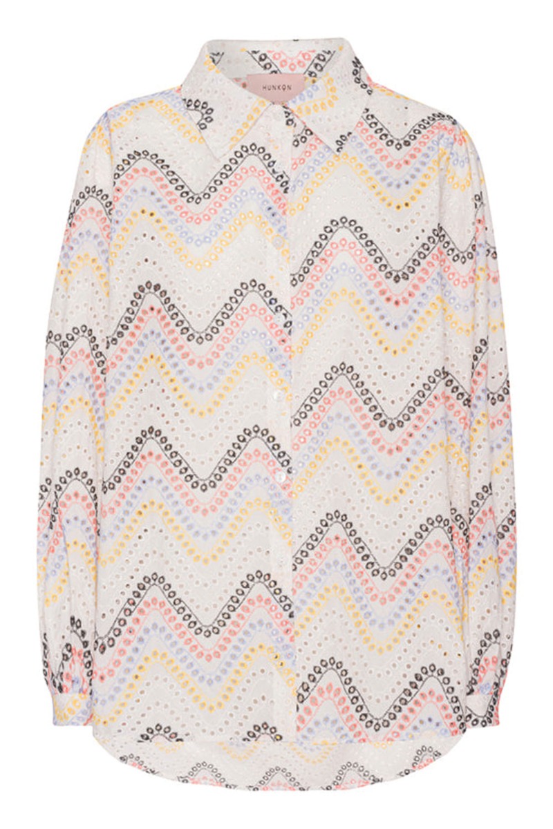 Vi ELSKER det nye broderi design fra Hunkøn. Denne skjorte er i en klassisk oversize pasform med broderet hulmønster. Skjorten er længere bagtil en foran hvilket giver et mere afslappet udtryk. Den er designet med det fineste bølge broderi i blå, gul og corale nuancer. Foran knappes skjorten og har lange ærmer der giver et lille puf.