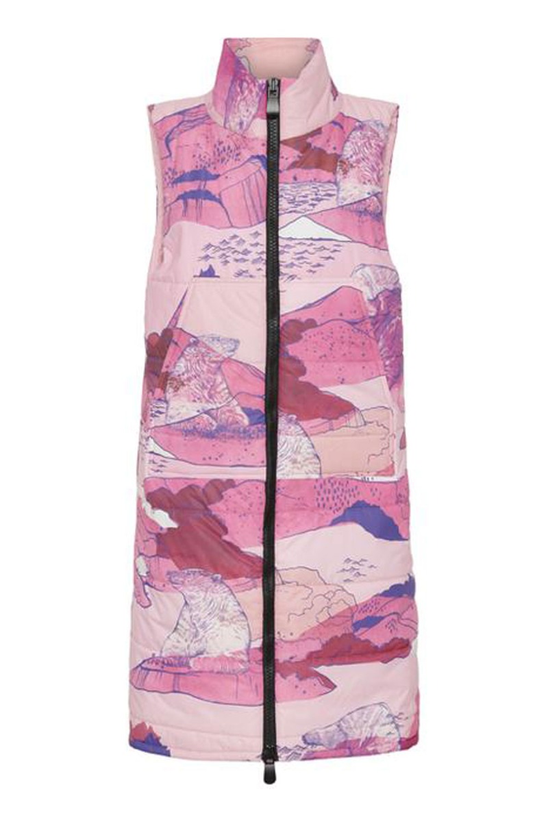 Lækker vatteret vest fra Hunkøn i en lang model i det smukke ice bear art print. Vesten har høj hals der lukkes med en grov to-vejs lynlås, hivlket giver dig masser af bevægelsesfrihed uden du mister varmen. Style den med de dejlige sweatshirts og matchende leggings for et unikt udtryk.