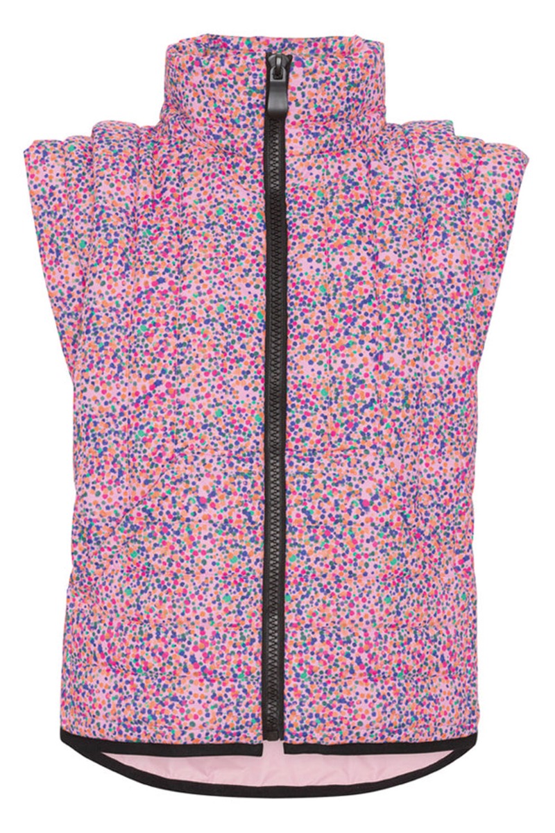 Vi ELSKER virkelig Hunkøns design med forskellige skæve detaljer som altid giver en masse glæde til hverdagen! Vesten her er lavet i en boxy pasform der er quiltet og vatteret med høj hals og lynlås foran. Foran har den lommer og cool skulderdetaljer. Den er genial til denne sæson og er designet i det skønneste multi confetti mønster med lyserød baggrund.