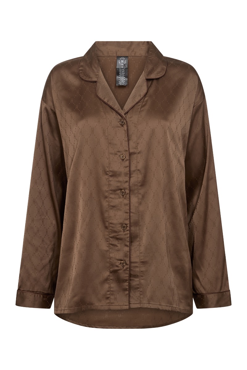 Her får du det fineste pyjamas sæt fra Hype The Detail i en dejlig blød brun satin kvalitet. Det er med denne skjorte overdel og en buks med elastik i taljen samt vide i benene. Det er helt let i kvaliteten og perfekt til at bruge til en filmaften eller som søndags tøj. Du køber her hele sættet - og der er begrænset antal.