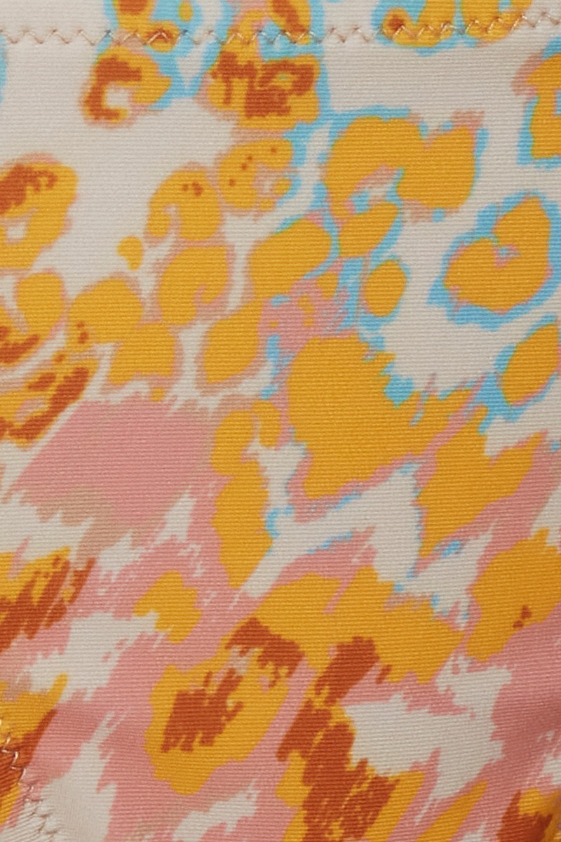Vi kan slet ikke vente med at hoppe i denne bikini med matchende top til de varme sommerdage på stranden! Trussen er trekantet med et grafisk print i gule, brune, blå og rosa nuancer. Style det som sæt.