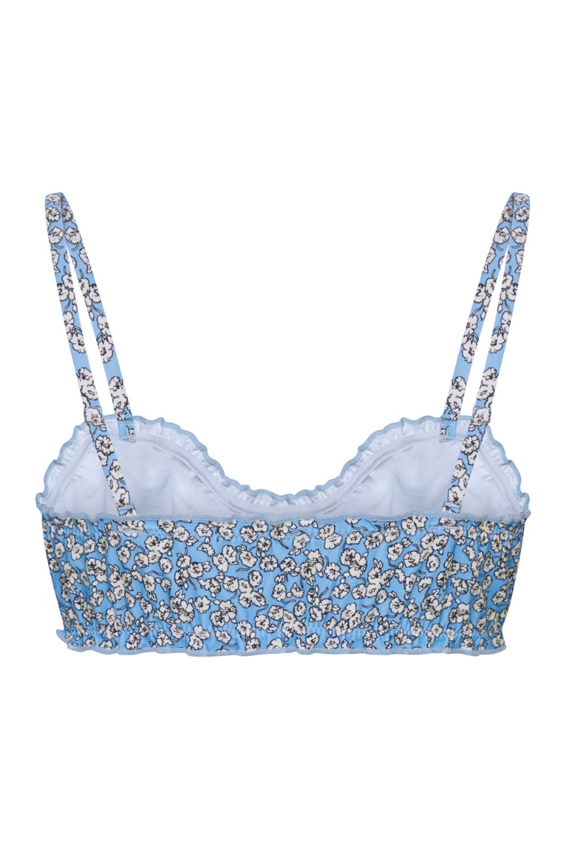 Sød bikini top fra Ichi med matchende underdel. Toppen er blå med et grafisk blomsterprint i hvid og sort. Den er designet i en sød pasform med elastik hele vejen rundt uden lukning bagtil. Stropperne kan justeres efter eget behov.