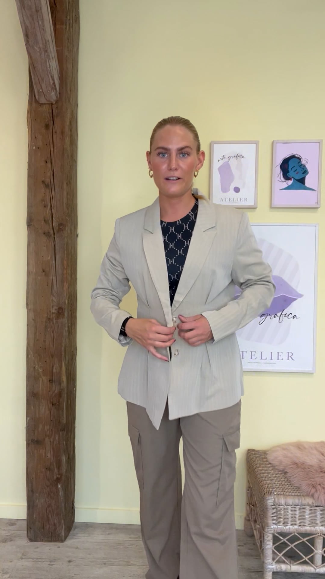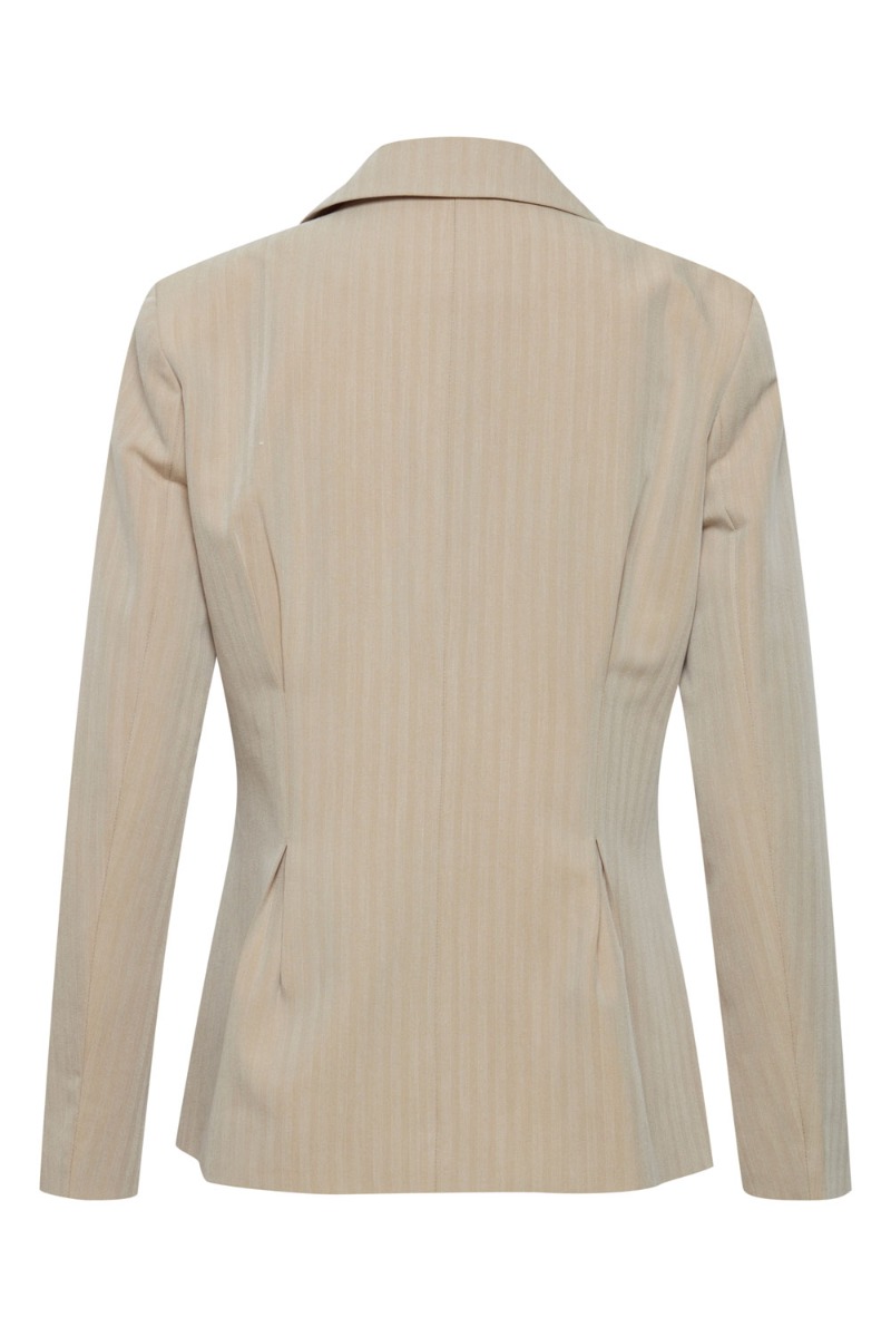 Beige blazer fra Ichi i et feminint snit. Blazeren giver en feminin talje med knaplukning foran og læg detalje. Den har en diskret stribe i stoffet og kan styles med de matchende shorts og vest alt efter hvilket look du ønsker. Blazeren i sig selv er altid super god at have liggende i garderoben til både fest og hverdag.