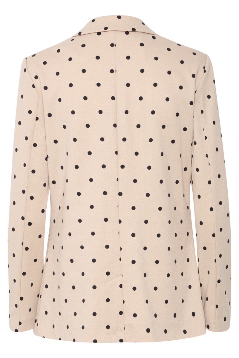 En cool blazer i beige med sorte prikker er kommet fra Ichi. Den er dejlig blød i kvaliteten og er med stræk, derfor er den også behagelig at have på hele dagen. Der findes matchende underdele så du nemt kan lave et sæt.