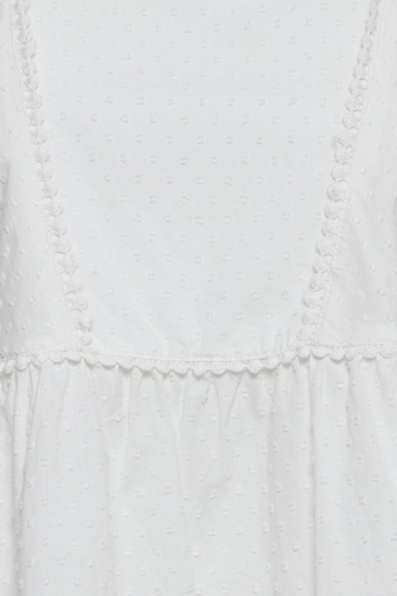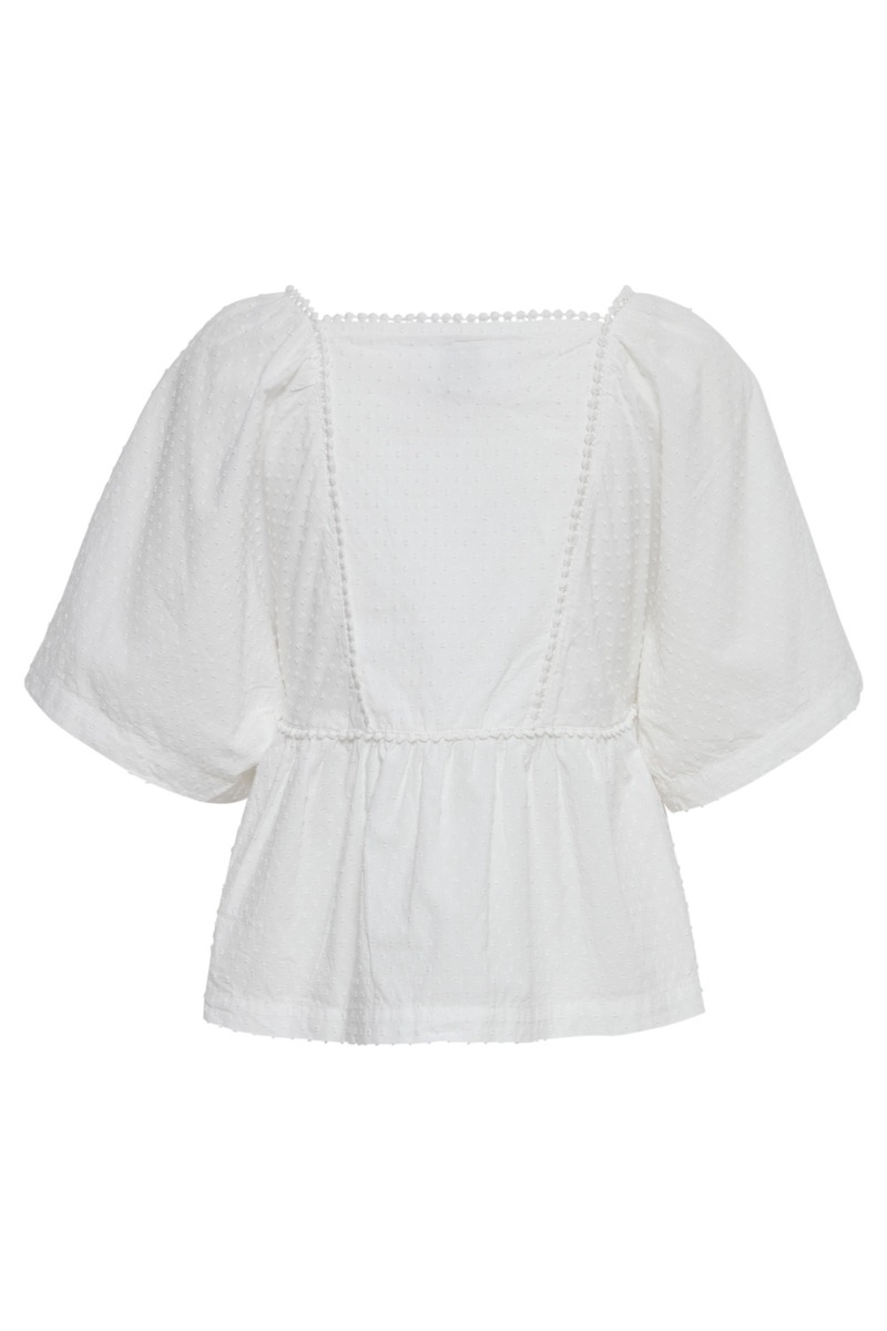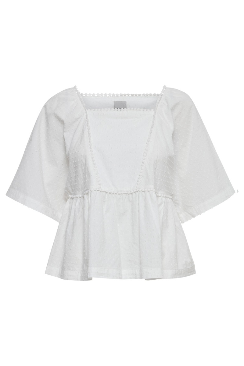 Smuk hvid bluse fra Ichi med hvide bomber og en sød blondeeffekt. Blusen er løstsiddende med peplum i bunden og en firkantet udskæring. Den er super fin at style til shorts eller jeans alt efter vejret.