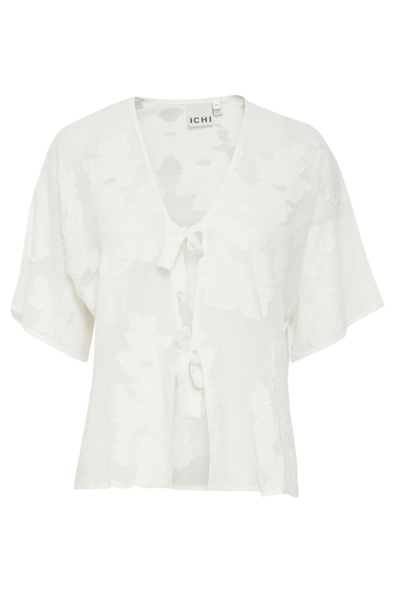 En fin bluse fra Ichi er kommet i en løs pasform og i en dejlig let kvalitet. Den er gennemsigtig og derfor anbefaler vi at du bruger en top under. Den lukkes foran med sløjfer og kan nemt bruges både til bukser og nederdel.
