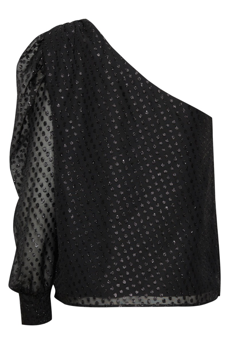 Den fineste one shoulder top fra Ichi. Blusen er sort med fine glimmer prikker på! På toppen er der et lille pufærme som slutter af ved håndleddet med en lille smock detalje. Derudover er der en skjult lynlås i den ene side og med en lille undertop, som gør at den ikke bliver gennemsigtig.