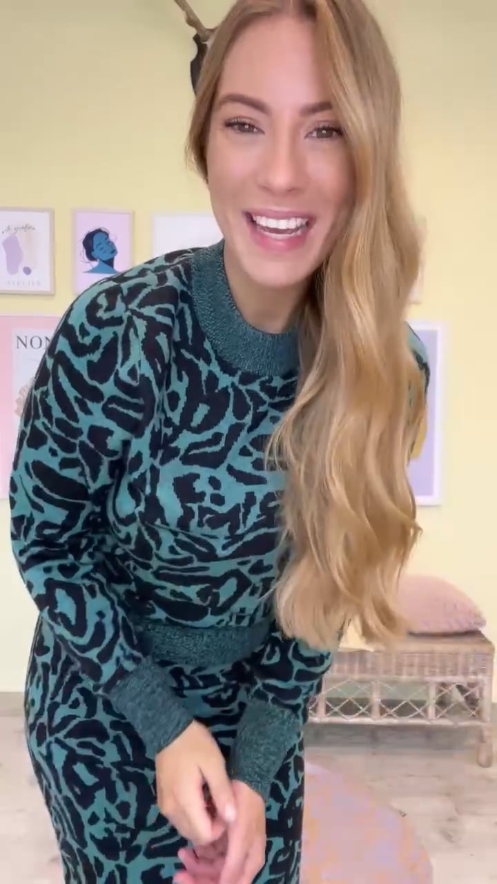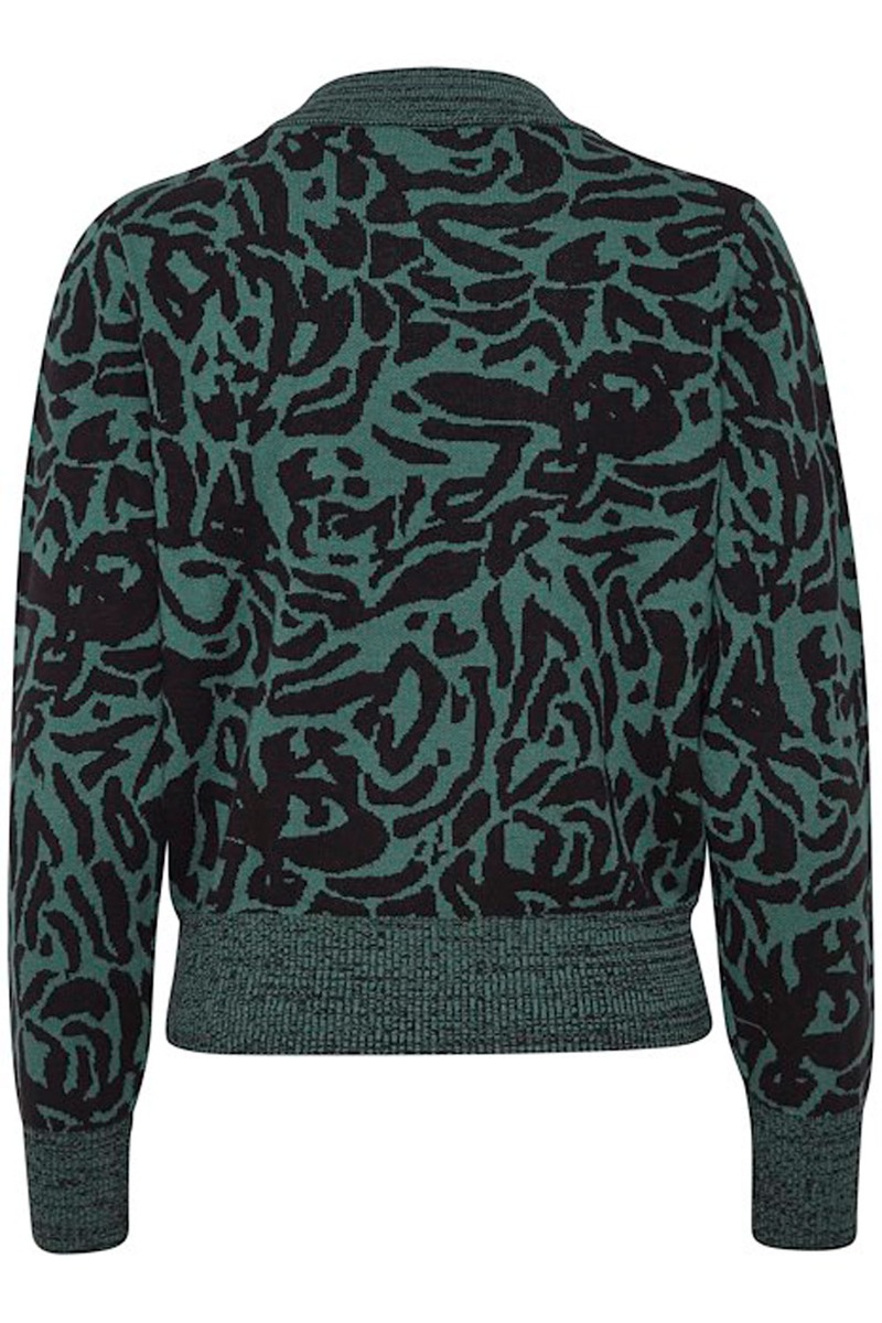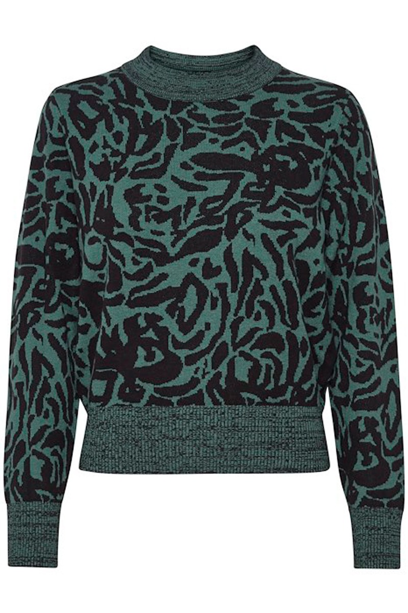 Dejlig blød strikbluse fra Ichi i et fint grøn og sort leo print. Strikken har løst snit med rund halsudskæring og lange ærmer. Den er i et blødt og behageligt strikmateriale som samtidig gør den utrolig strækbar. For et fuldendt look styl med den matchende nederdel.