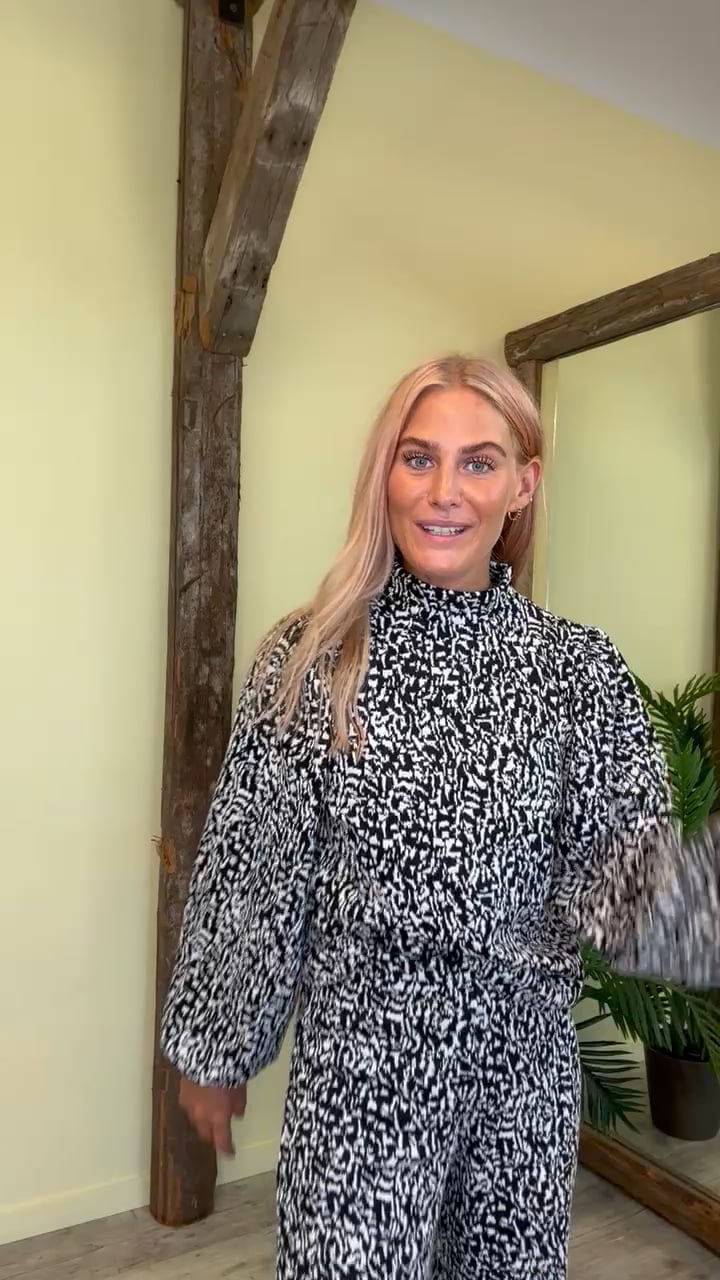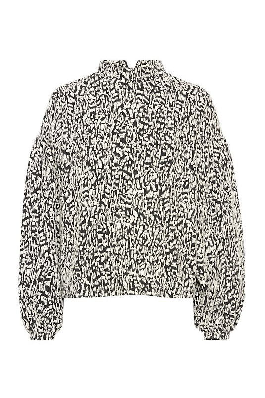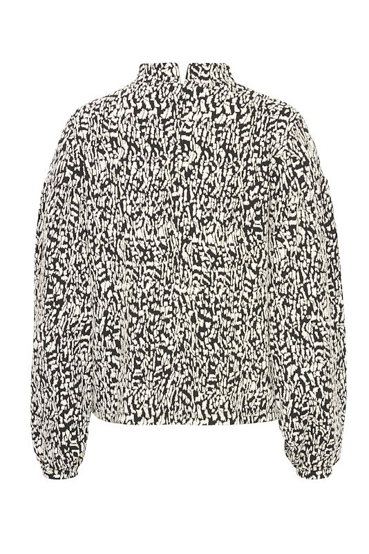 En feminin bluse fra Ichi! Denne bluse har et cool print i sort og hvid. Blusen har store ærmer med en smule puff-effekt. Brug den evt. med matchende bukser.