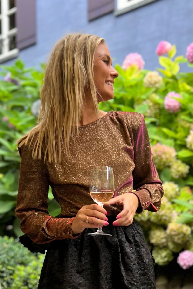 Wauw den smukkeste glimmerbluse fra Ichi i et smukt og elegant design. Blusen har en tætsiddende pasform med lange ærmer som bliver afsluttet med knappedetaljer. Den har skulderpuder, rund halsudskæring og den flotteste shineeffekt som skifter farve alt efter lyset - WAUW!