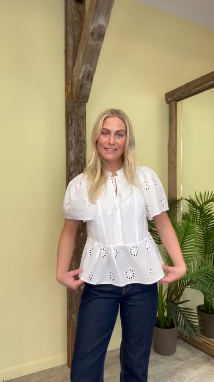 En rigtig sommertop er landet i en blonde kvalitet med store blomster fra Ichi. Den er foret ved brystet så den ikke er gennemsigtig. Derudover er der peplumeffekt i bunden og ved ærmer. Den har en lille sløjfe detalje ved brystet som også markeres med en flæsekant.