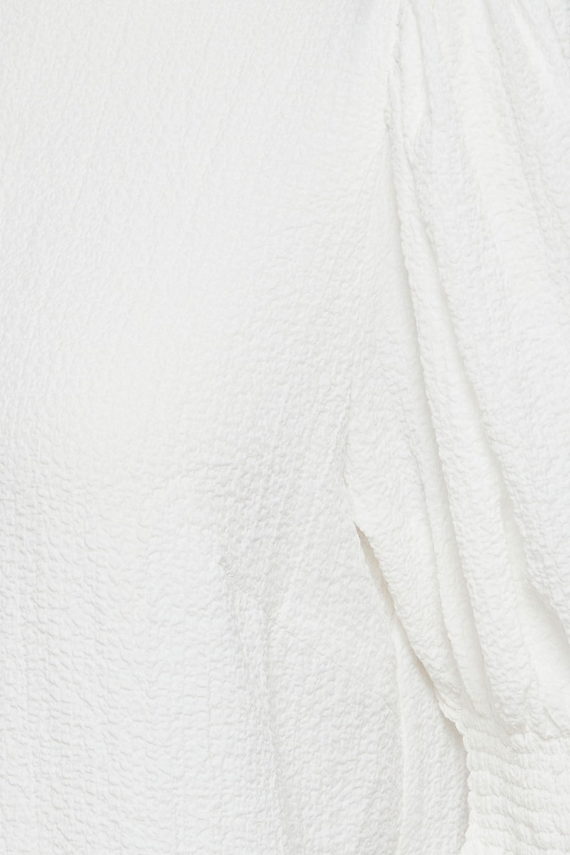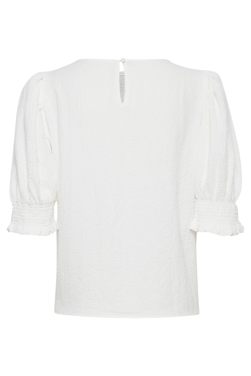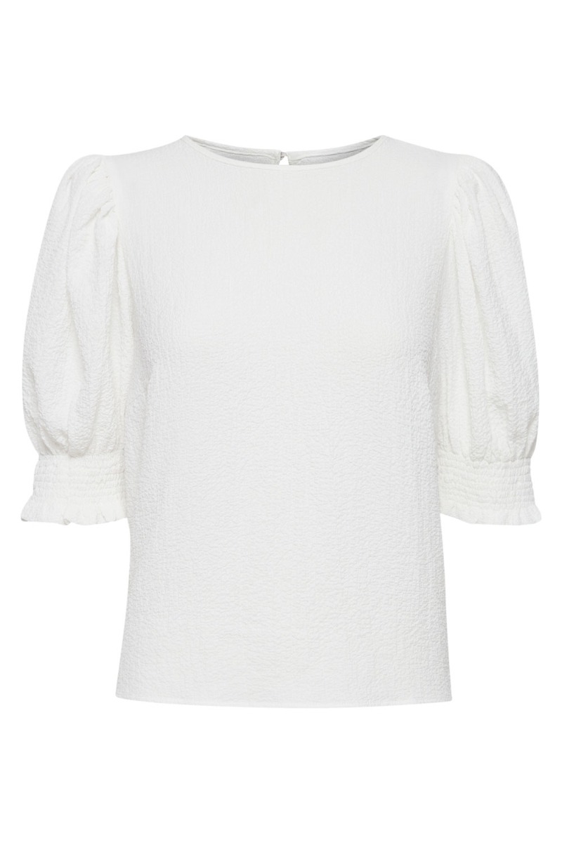 Enkel hvid bluse fra Ichi i crepe materiale der giver en fin struktur. Toppen er med rund halsudskæring og ballon-snit ved ærmerne. Den lukkes i nakken ved den runde halsudskæring og kan styles både til hverdag og festlig anledning.