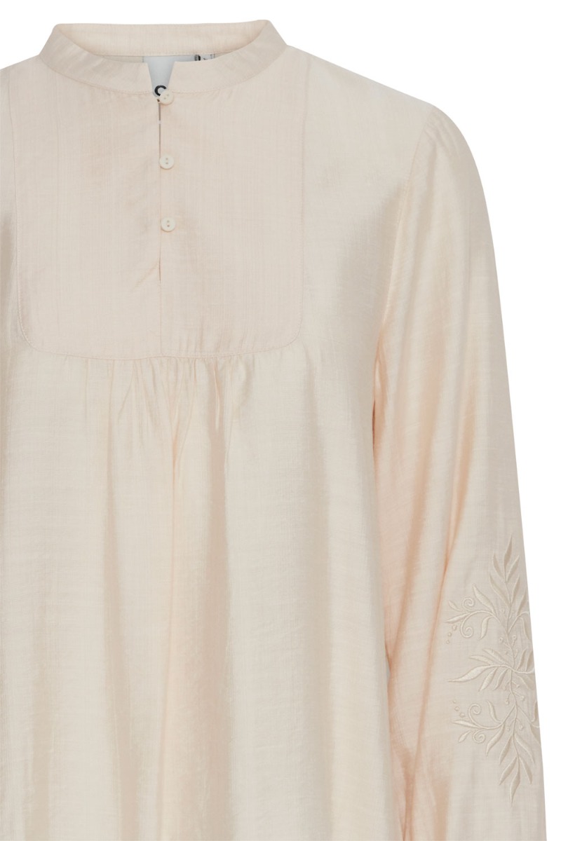 Den sødeste bluse fra Ichi. Blusen er i en smuk lys sandarve med broderede blomsterprint på ærmerne, som afsluttes med et elastik. Den har kinakrave og tre fine knapper foran. Derudover er der en lille rynkeeffekt foran som gør at blusen for en peblum effekt.