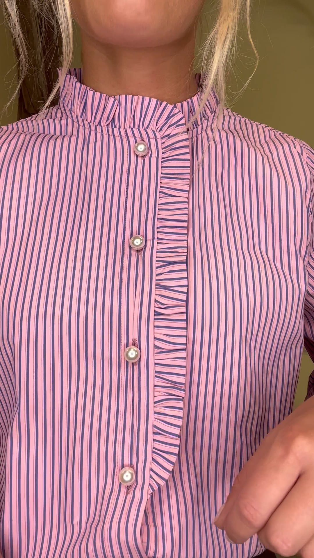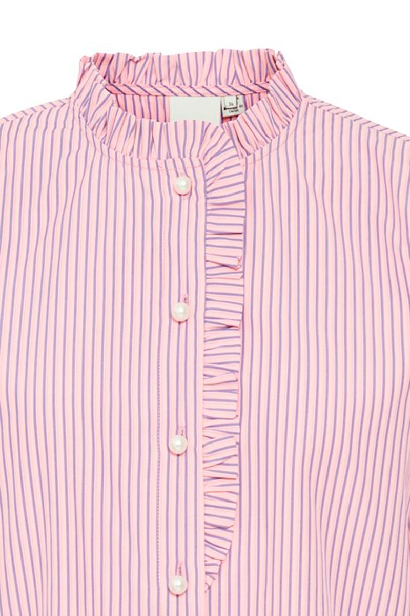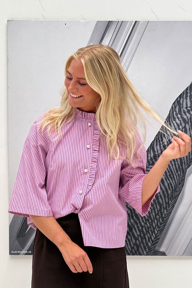 Ej piger, se lige den fineste bluse fra Ichi. En vaskeægte LYKKE bluse i flot pink nuance med små tynde mørkeblå striber. Blusen har et løstsiddende snit med 3/4 ærmer med vidde effekt. Derudover er den pyntet med fine perlemorsknapper foran, samt flæsedetalje langs kanten ved perlerne. Så fin en bluse som du nemt kan style til både hverdag og fest.