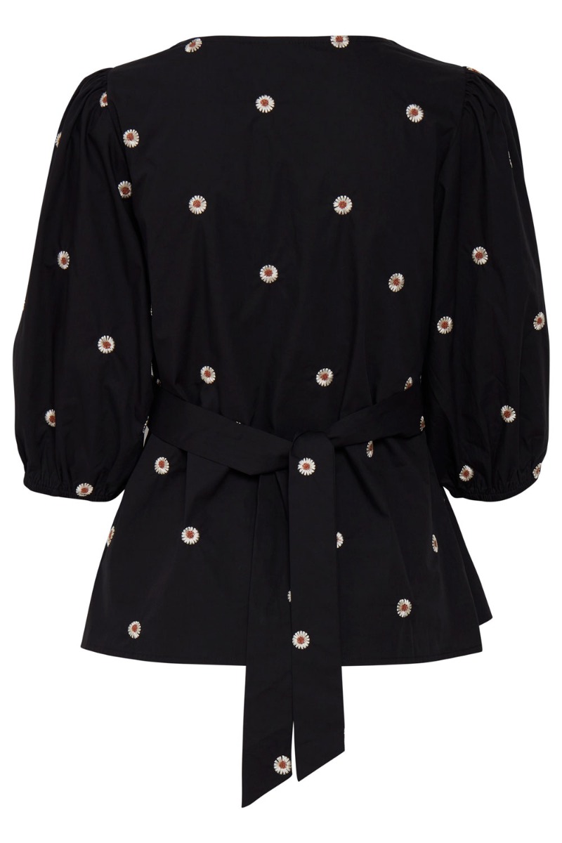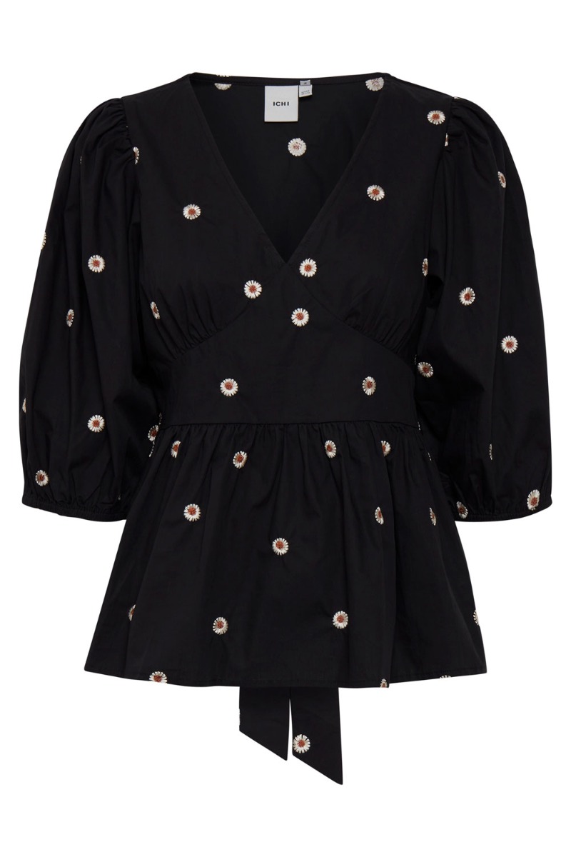 Sort bluse fra Ichi med små broderet blomster. Blusen er med bindebånd i taljen der giver en sød peplumdetalje i bunden. Blusen er med v-udskæring og trekvartærmer med elastik i enden der giver et fint ballonsnit. Style den til jeans.