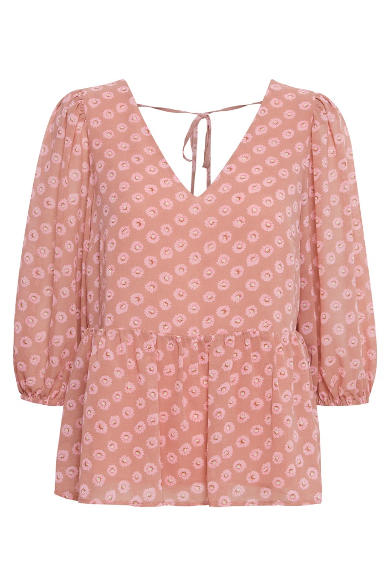 Den smukke skjorte fra Ichi er perfekt til de kommende sommerfester. Den er i et fint transparent materiale med det skønneste blomsterprint i lyserøde nuancer. Blusen har en firkantet udskæring der lukkes i nakken med snøre, der giver den smukkeste åben ryg. Ærmerne er 3/4 med elastikkant og har peplum i bunden. Style den til shorts eller et par "pæne" bukser.
