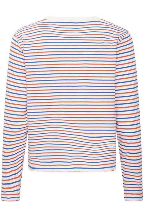 Langærmet bluse fra Ichi. Denne bluse har en let og blød kvalitet, lange ærmer og et stribet mønster. Blusen har en hvid baggrundsfarve med striber i blå og orange. Et enkelt design, som er super nem at style til hverdag.