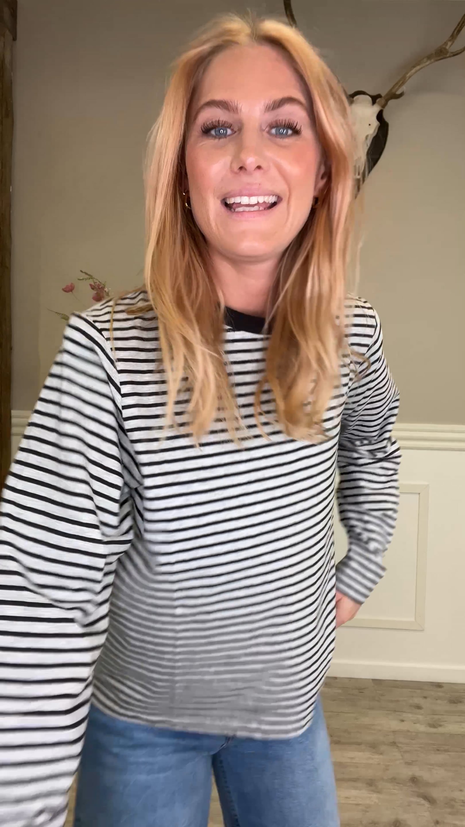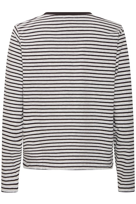 Langærmet bluse fra Ichi. Denne bluse har en let og blød kvalitet, lange ærmer og et stribet mønster. Blusen har en grå baggrundsfarve med striber i sort. Et enkelt design, som er super nem at style til hverdag.