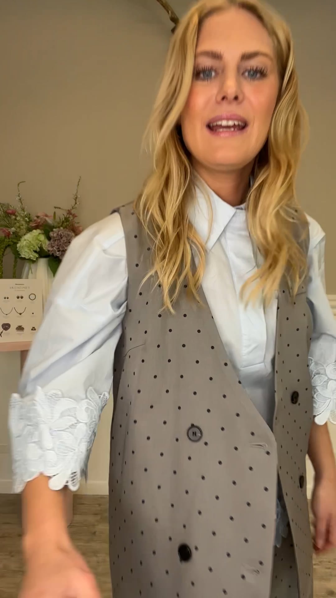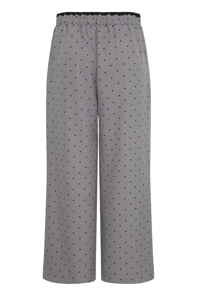 Det er et par løstsiddende bukser i en støvet grå nuance med et diskret prikket mønster. Bukserne har lige, brede ben, som giver et afslappet og elegant fald. Taljen er elastisk med sort bindebånd, hvilket tilføjer et casual udtryk og gør dem komfortable at have på. Det enkle snit kombineret med det grafiske print giver bukserne et moderne look, der balancerer mellem afslappet og sofistikeret.