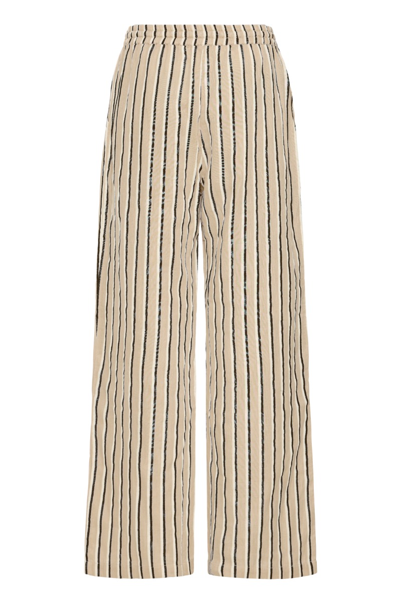 Afslappede bukser i en let og luftig kvalitet med lodrette striber i beige og mørke nuancer, som giver et moderne og sommerligt udtryk. Modellen har elastisk talje med bindebånd for en behagelig og fleksibel pasform samt lige, løstsiddende ben, der falder flot. Perfekte til både hverdagsbrug og feriestemning, hvor komfort og stil går hånd i hånd.