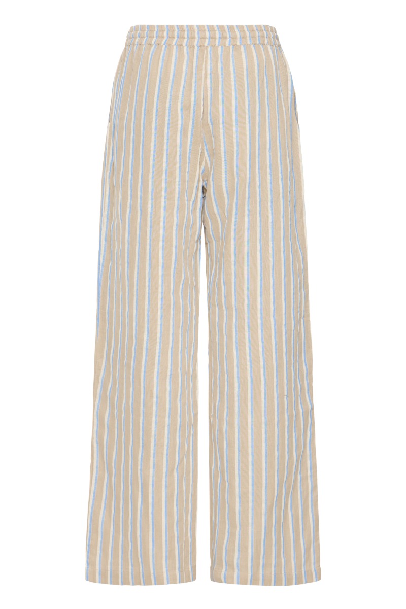 Lette og afslappede bukser i en luftig kvalitet med fine lodrette striber i beige og lyseblå nuancer. Modellen har elastisk talje med bindebånd, som giver en fleksibel og behagelig pasform, samt lige ben med et casual fald. Et nemt valg til varme dage, hvor komfort og et afslappet udtryk er i fokus.