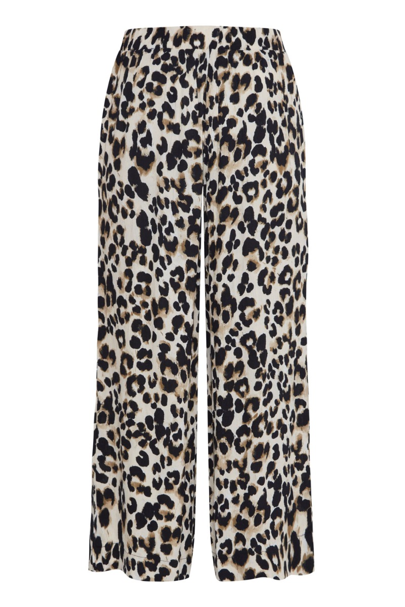 Løse bukser fra Ichi i et flot leopard print i brune nuancer. Bukserne er designet i en let og behagelig kvalitet der er perfekt til de lune og varme sommerdage. Bukserne er lige i benene i et løst snit med elastikkant i taljen og en cropped længde. Style dem med den matchende t-shirt eller brug en hvid skjorte til alt efter anledning.