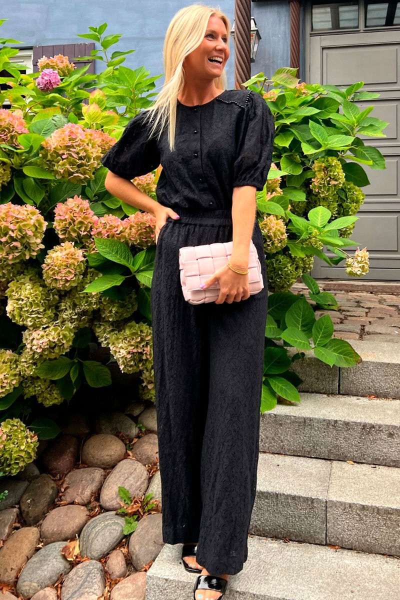 Fineste blondebukser fra Ichi i en sort farve. Bukserne har en løs pasform med et lige ben. De bliver i taljen lukket med elastikkant. Bukserne er foret med en sort underbuks, således de ikke bliver gennemsigtige. For et fuldendt look er det oplagt at style med den matchende bluse.