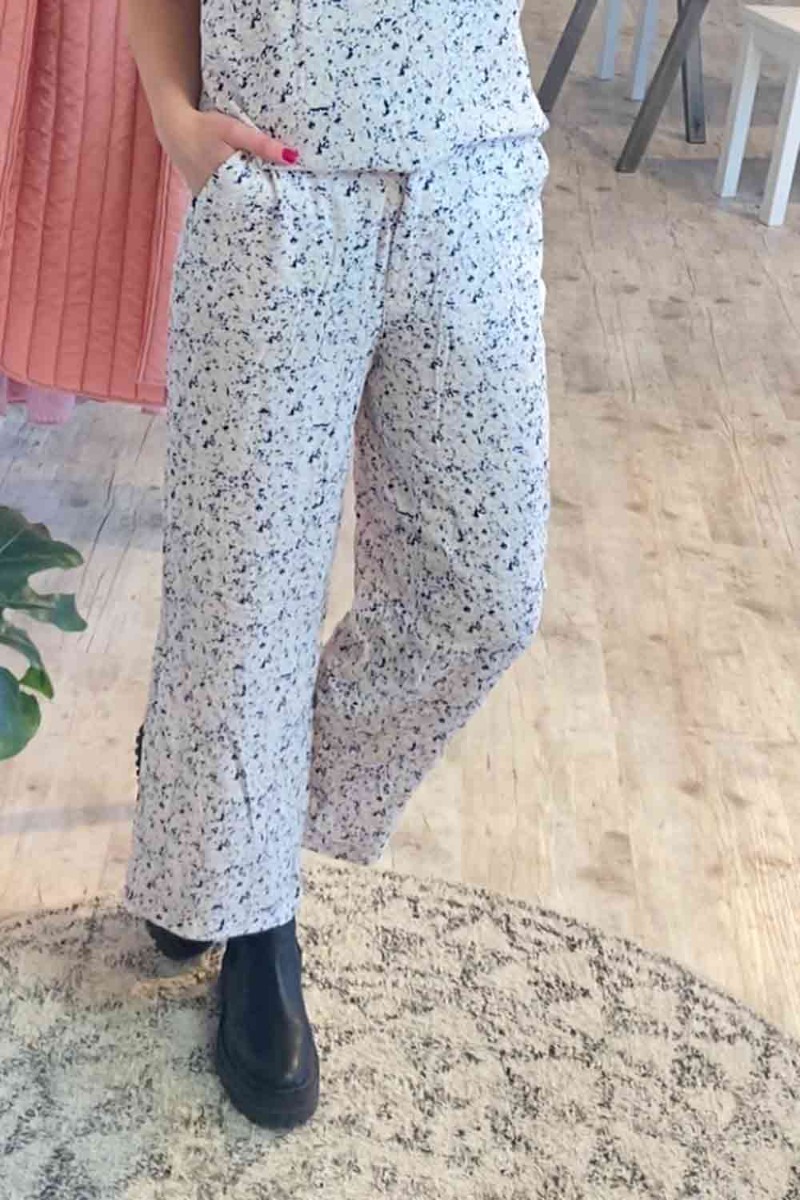 Fine pastel lilla bukser med et grafisk print der stråler af forår. Bukserne er med fast linning og elastikkant bagtil der lukkes med knaplukning og lynlås. De har et løst-snit i et let materiale i en cropped længde. Style dem med den matchende t-shirt og fuldend looket eller brug en gul eller lilla skjorte eller strik dertil.
