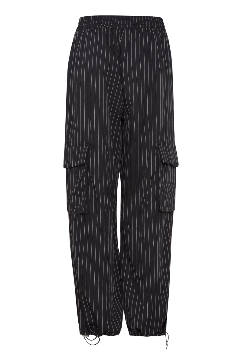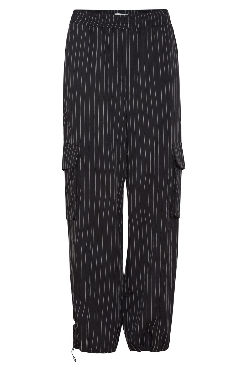 Cool bukser fra Ichi i sort med hvide nålsestriber. Bukserne er med skrålommer i begge sider samt lommer på ydersiden af benet for at give dette cargolook. Der er mulighed for at snørre buksebenene ind, men også at bruge dem med de brede bukseben. Brug dem gerne sammen med den matchende vest.