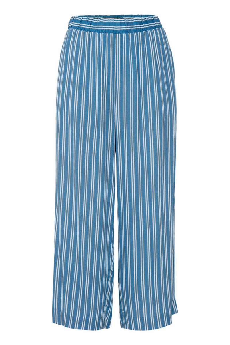 Bukser i løstsiddende pasform fra Ichi. Bukserne er i den fineste blå med hvide striber. Der er elastik i taljen og længden er en smule cropped. Helt perfekt at style med T-shirt eller top i samme print.