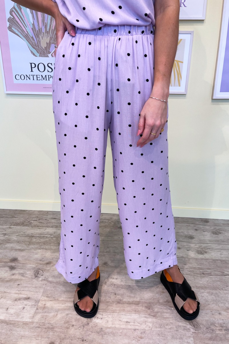 Sødeste bukser fra ICHI i lilla med sorte prikker. Der er elastik i taljen som gør at de bare sidder helt perfekt. De har en dejlig løs pasform som gør dem fantatiske at have på hele dagen. Perfekt til sommeren med en sød t-shirt.