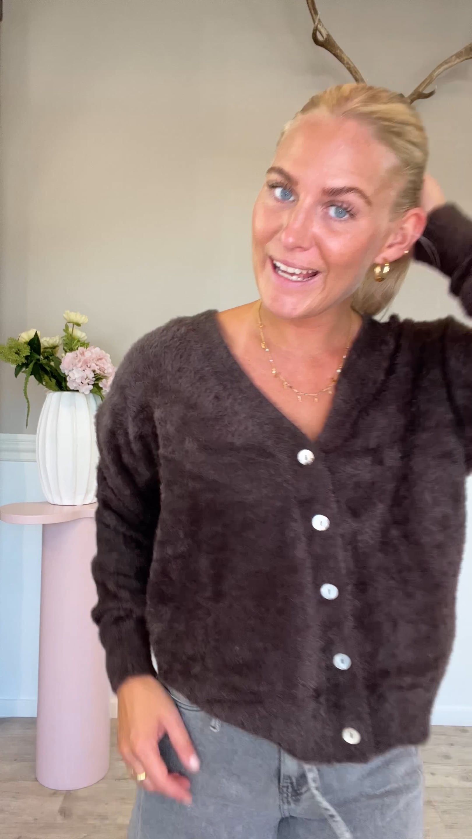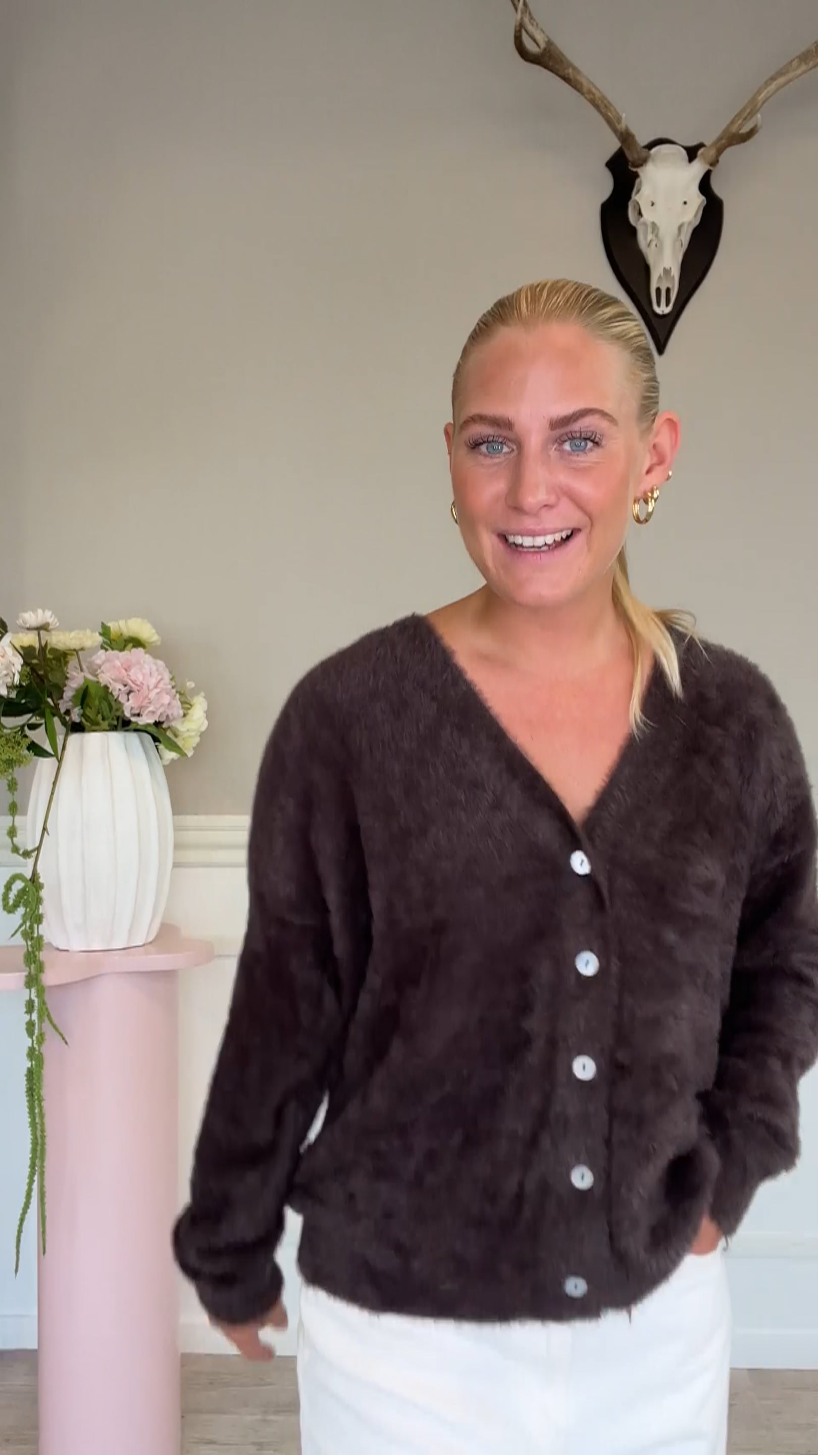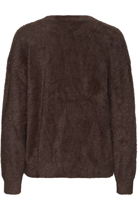 Denne fluffy chokolade brune cardigan fra Ichi er en del af en helt særlig Co-lab kollektion mellem den populære influenzer Bruna Rizk aka @brunabear. Denne cardigan har det hyggeligste udtryk med sit fluffy look! Den har nemlig en pelset overflade, som er super blød og lukkes med knapper foran.