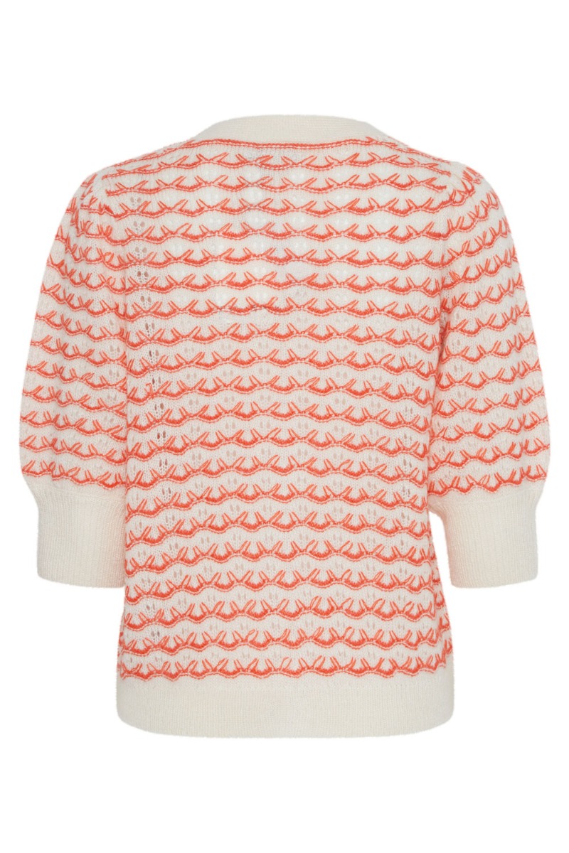 Sød cardigan fra Ichi i en strikkvalitet og med korte ærmer. Cardiganen har en råhvid bundfarve og med et fint organge/rødt mønster. Den har knapper hele vejen ned og har en v-udskæring. Cardiganen findes også i en beige med blåt mønster. Style de til et par jeans eller en nederdel.