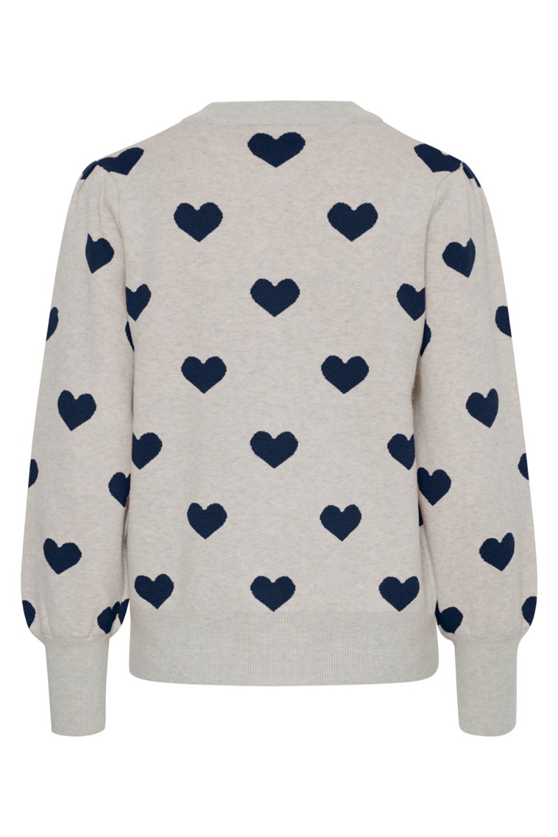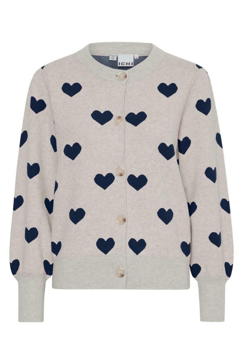 En sød cardigan er kommet fra Ichi. Den er beige farve med hjerter på i en smuk navy farve. Den lukkes foran med knapper og har den klassiske runde halsudskæring samt den afsluttes med ribkant ved ærmer, bund og hals. Den er i den blødeste kvalitet og er helt tæt i strikken så den ikke er gennemsigtig. En fin model til et par jeans eller en stram nederdel.