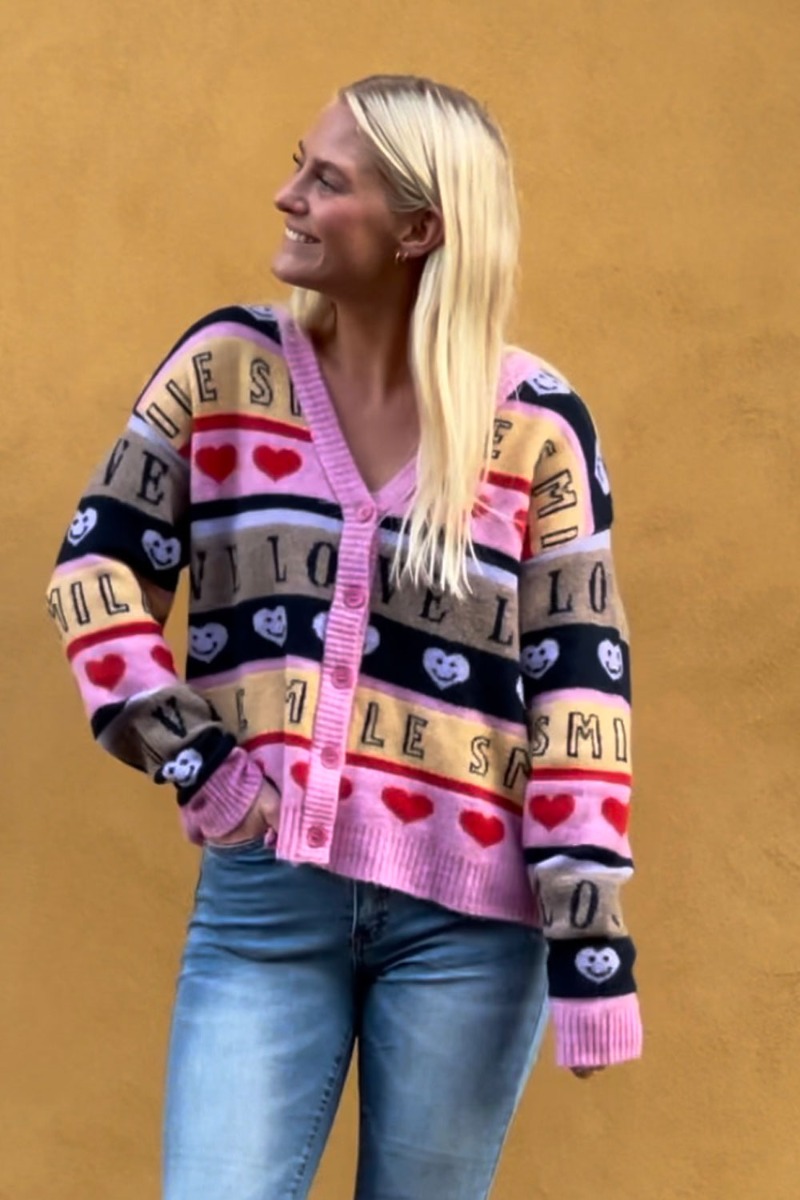 En cool blød strik cardigan fra ICHI i det sejeste print. Cardiganen har knapper foran med v-udskæring og er designet med det fineste farverige mønster med tekst, smileys, hjerter og flere søde figurer. Style den til et par jeans eller en feminin nederdel til hverdagslooket.