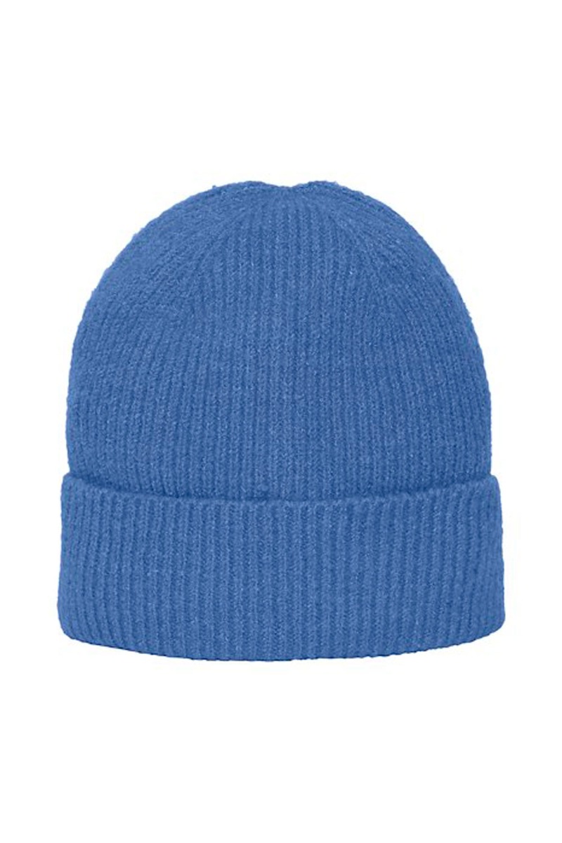 Lækreste strikhue fra Ichi i en smuk blå farve. En blød og dejlig varm hue med en foldekant og den SEJESTE farvenuance. For et fuldendt vinterlook styl med de matchende strikvanter.