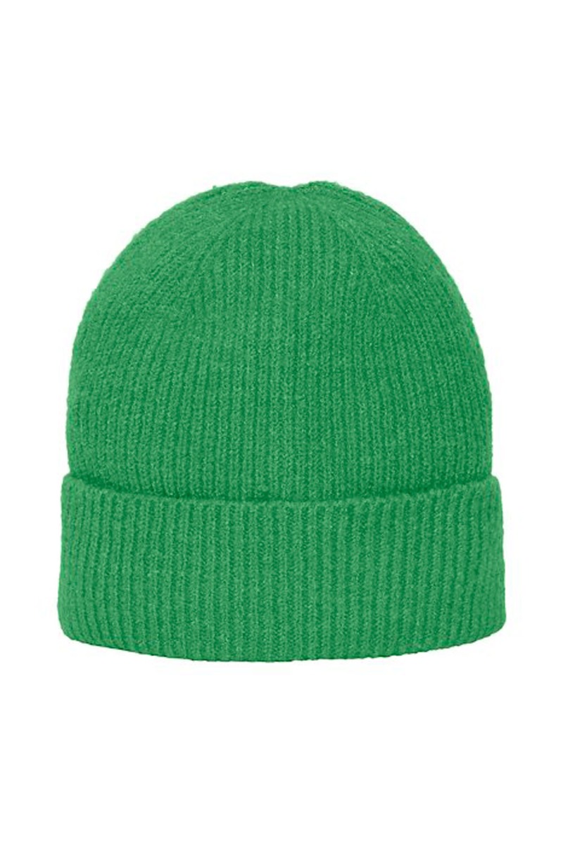 Lækreste strikhue fra Ichi i en smuk græsgrøn farve. En blød og dejlig varm hue med en foldekant og den SEJESTE farvenuance.