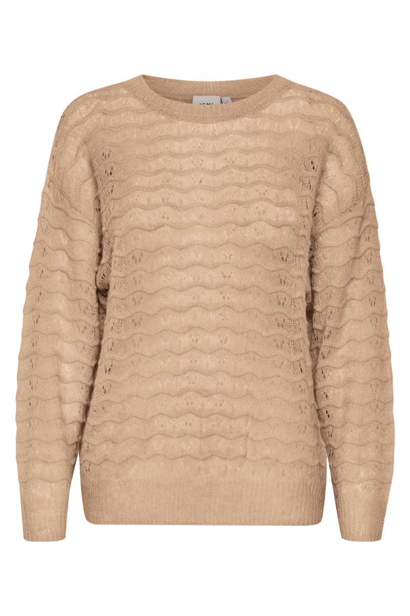 Blød og behagelig strik fra Ichi med et hullet mønster der giver en sød feminin detalje. Strikken er med rund hals med ribkant ved hals, håndled og bund. Vi anbefaler at tage en basis top under.