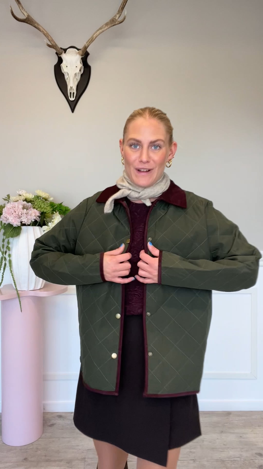 En fin quilted jakke fra Ichi er kommet i grøn med detalljer i bordeaux i fløjlskvalitet. Den knappes foran og er en perfekt overgangsjakke til denne sæson med en strik under. Den findes også i navy.