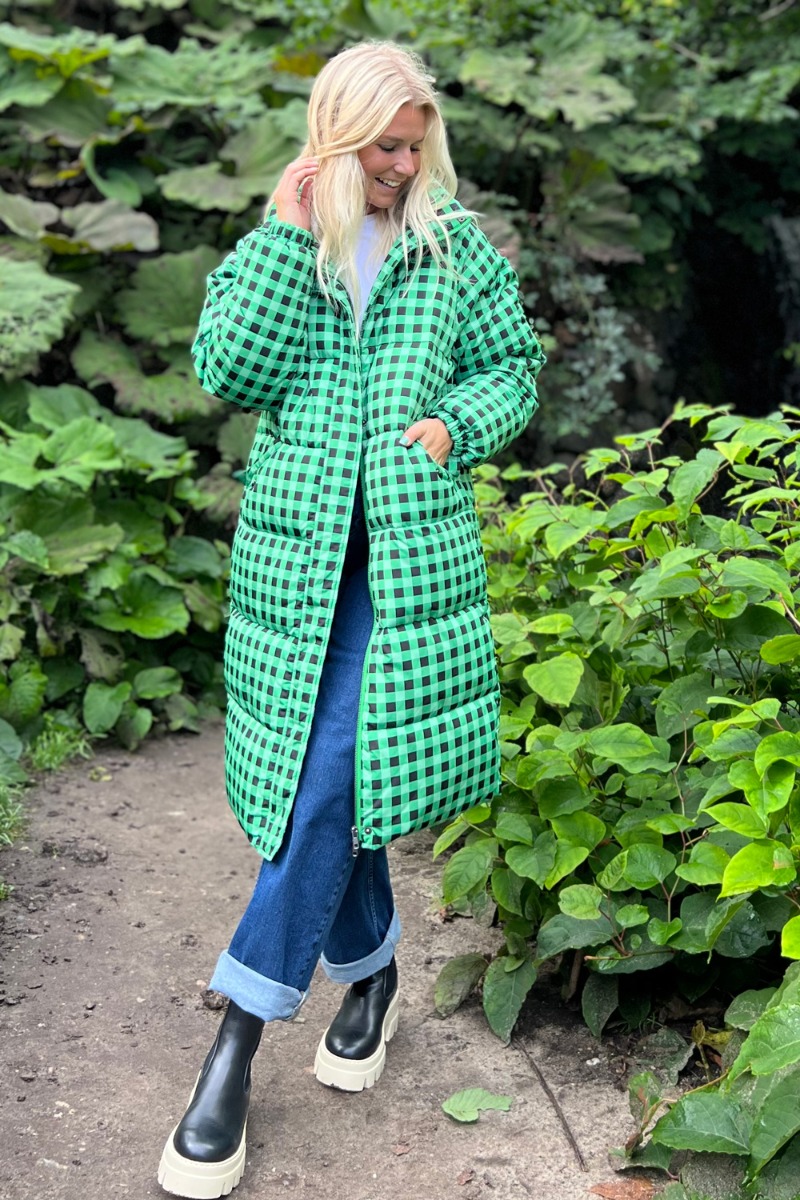 OKAY PIGER... Jakken er landet fra Ichi og WAUW hvor er den sej! Den er designet i et ternet mønster i grønne nuancer med lynlås foran og høj hals samt trykknapper foran. Den er lavet i et puffet look med elastik ved håndleddet der holder kulden ude.