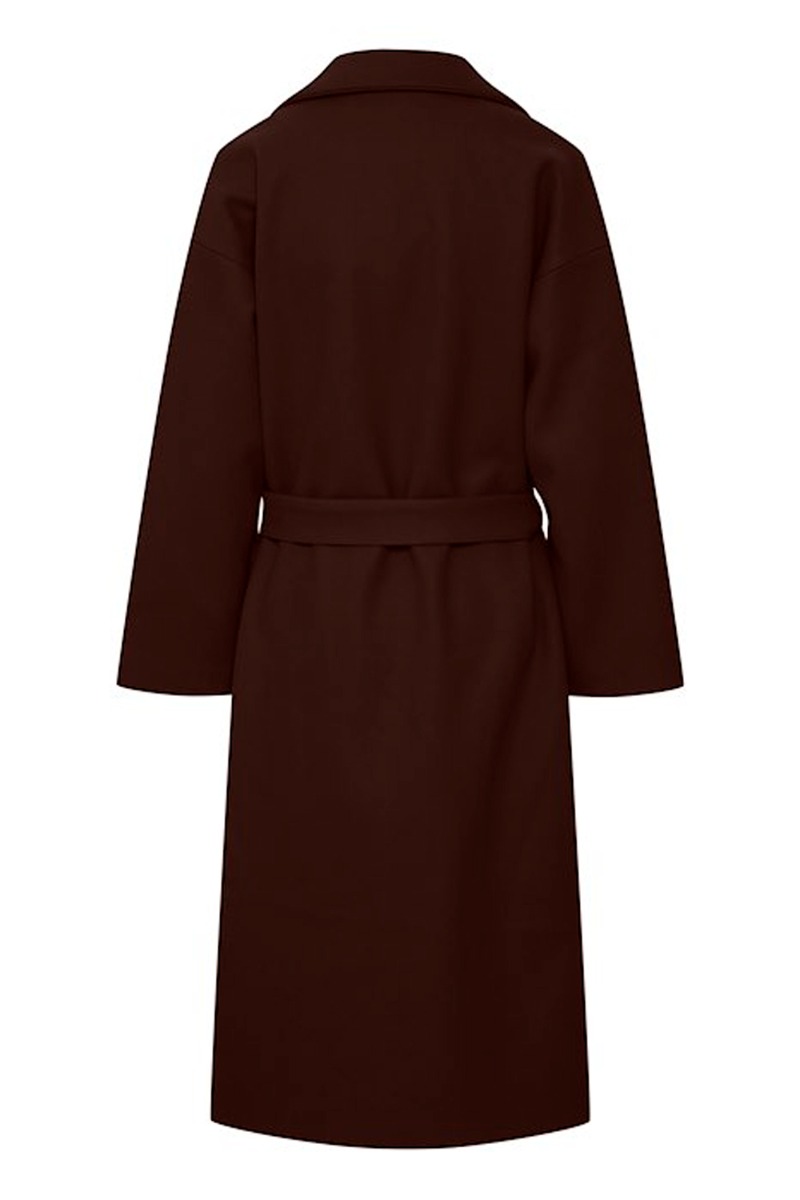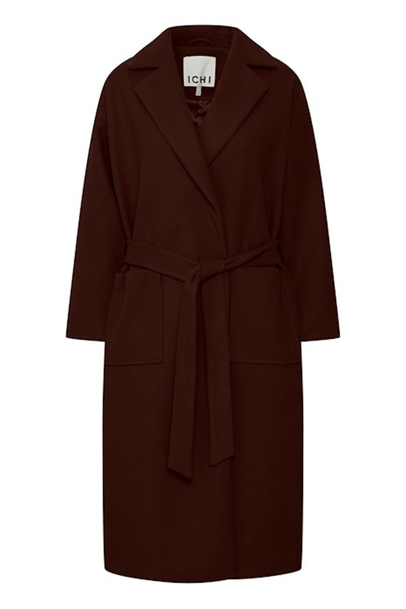 Lækker vinterjakke fra ICHI i smuk mørkebrun farve, der passer perfekt til efterårets og vinterens farver. Jakke har et løst fit og et bindebånd i taljen.