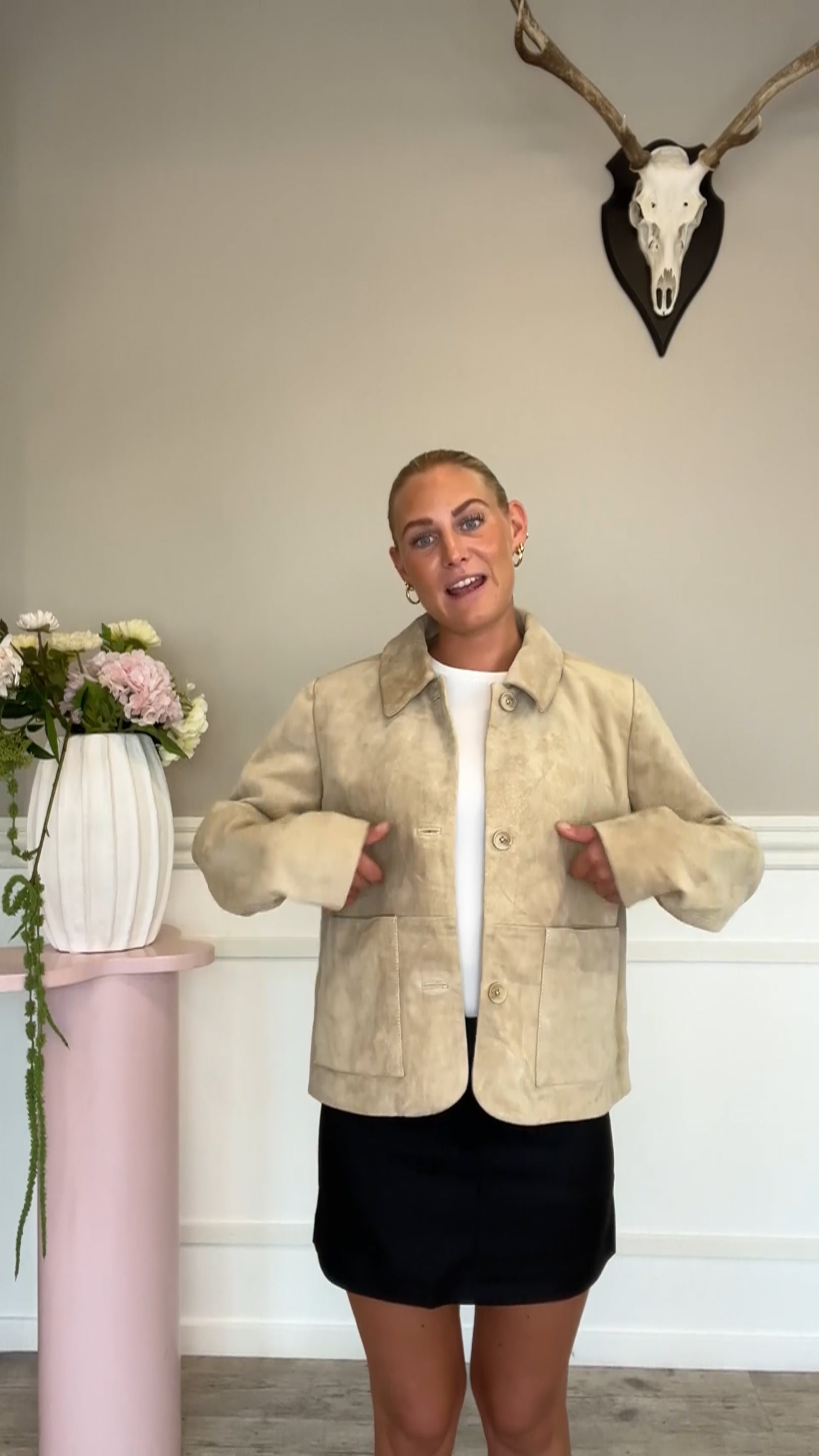 Denne suede jakke er super fin og flot i denne moderigtige sand nuance, med et enkelt design, som passer til alle outfits. Jakken har en blød kvalitet, knaplukning samt lommer foran. Jakken har et shiny inderfor.
