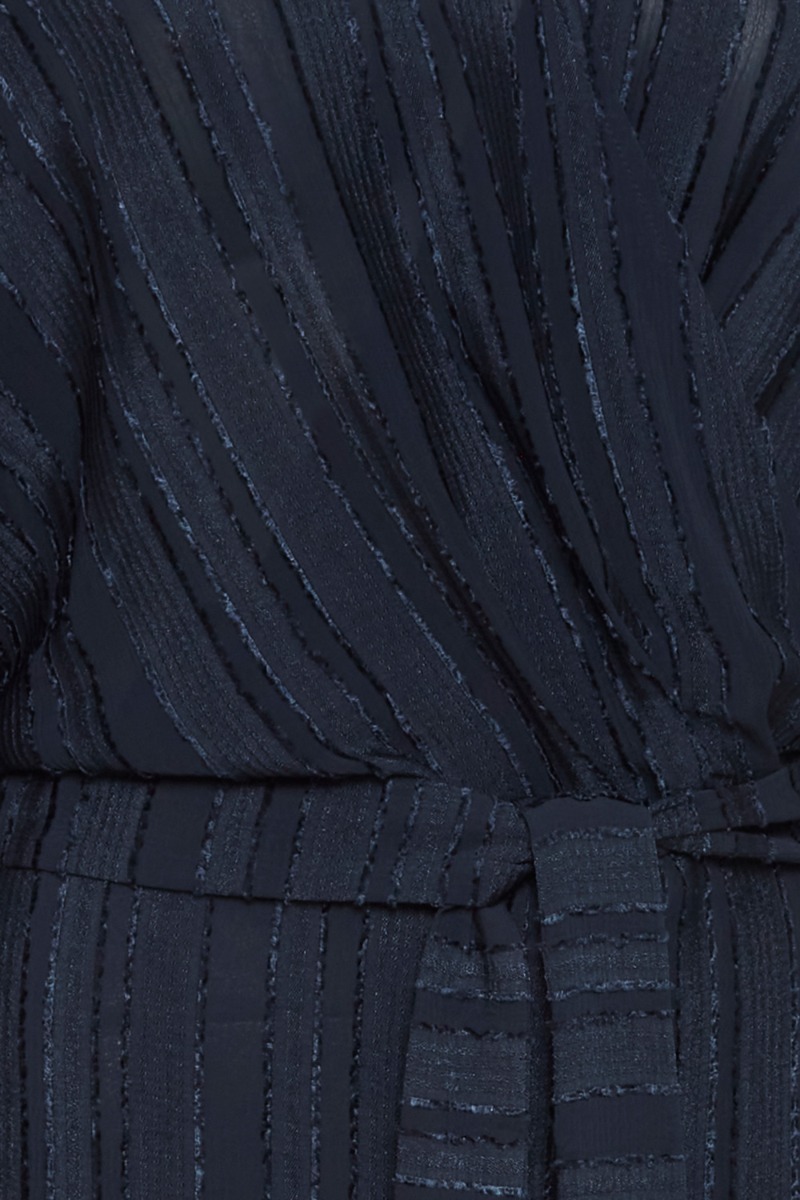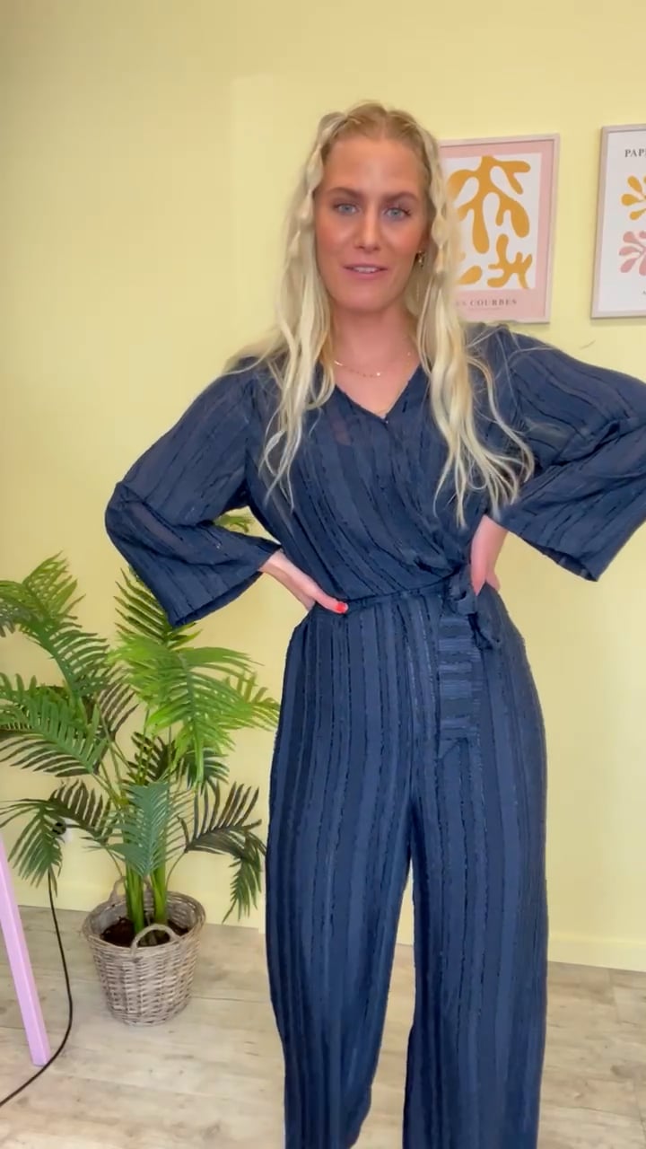 En smuk feminin jumpsuit fra Ichi i navy med de fineste detaljer. Jumpsuiten er lavet i en let gennemsigtig kvalitet der er foret indvendigt så den ikke bliver gennemsigtig. Den har elastik bagtil og bindebånd der giver en smuk talje. Jumpsuiten har brede ben, 3/4 ærmer og en lille skjult trykknap ved barmen. Style den med en stilet til de kommende fester.