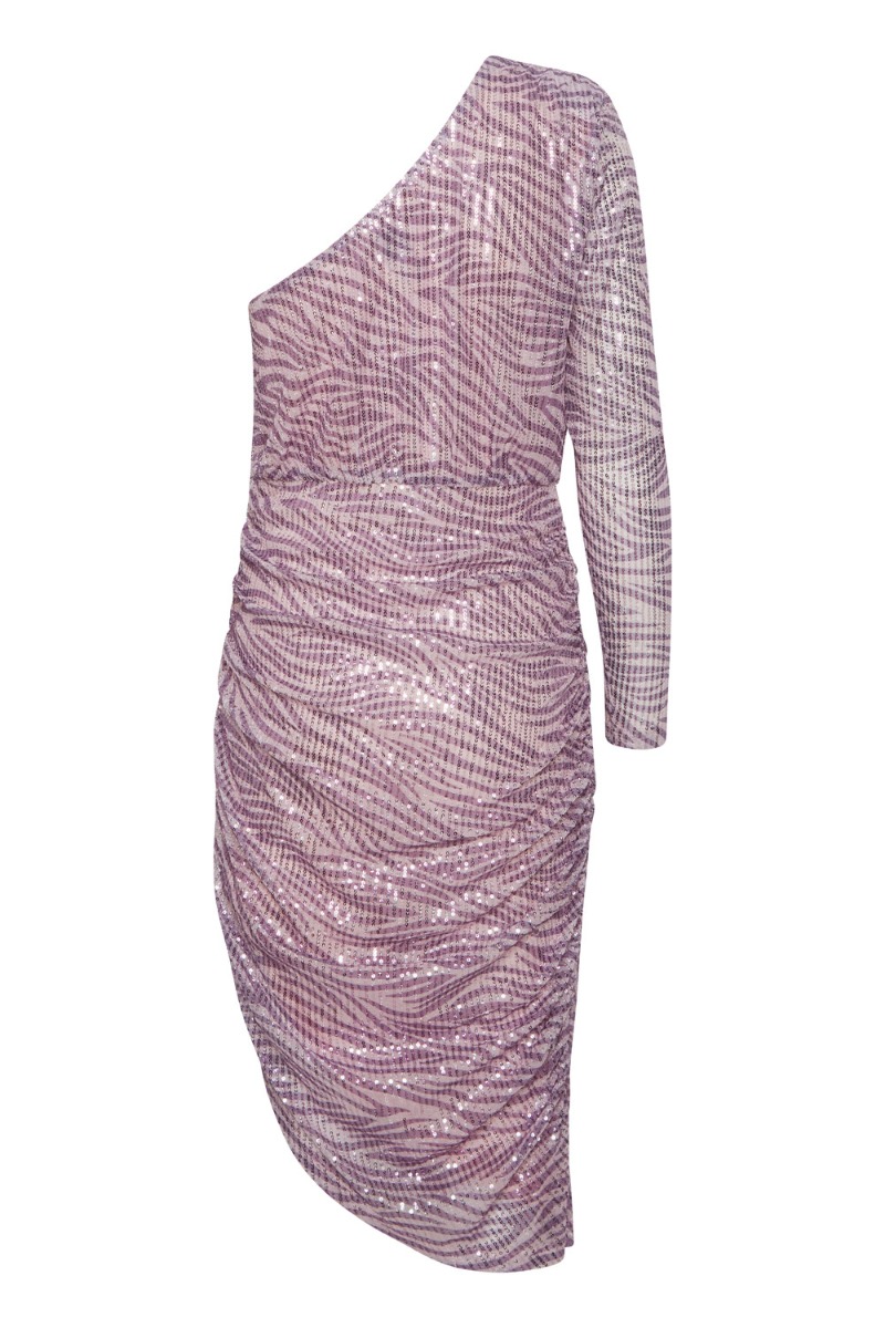 Wauw, en smuk kjole fra Ichi i pink paillet. Kjolen har et zebraprint med one-shoulders og pufærme. Den er tætsiddende med rynkeeffekt der giver den fineste feminine pasform så du er klar til at hoppe til diverse julefrokoster med en stilet eller høj støvle!