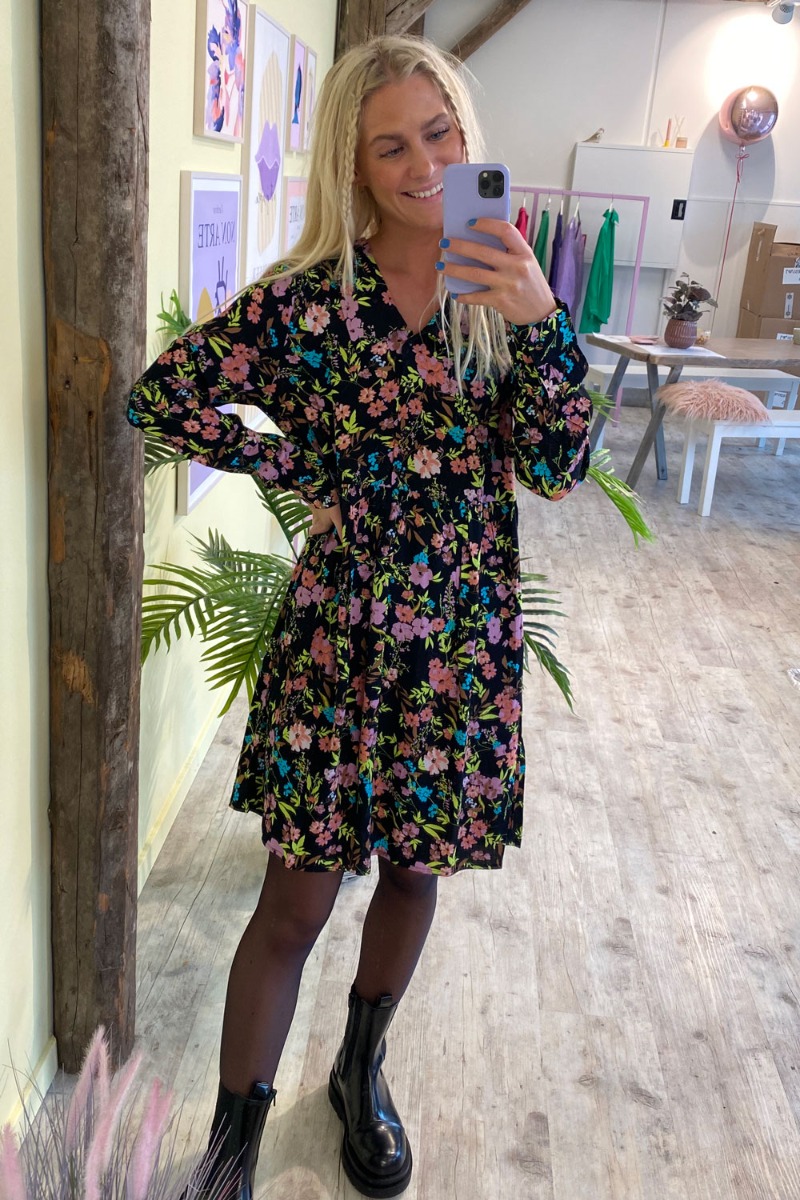En sød kort kjole fra Ichi med sort baggrund og blomstret mønster i skønne lilla, gule og blå nuancer. Kjolen er løs med en tydelig syning ved taljen der giver en to-delt-effekt. Foran lukkes den med stofbetrukket knapper ved den lille v-udskæring og skjortekrave. Ærmerne knappes med en enkelt knaplukning og er super fin at style med en rå støvle.